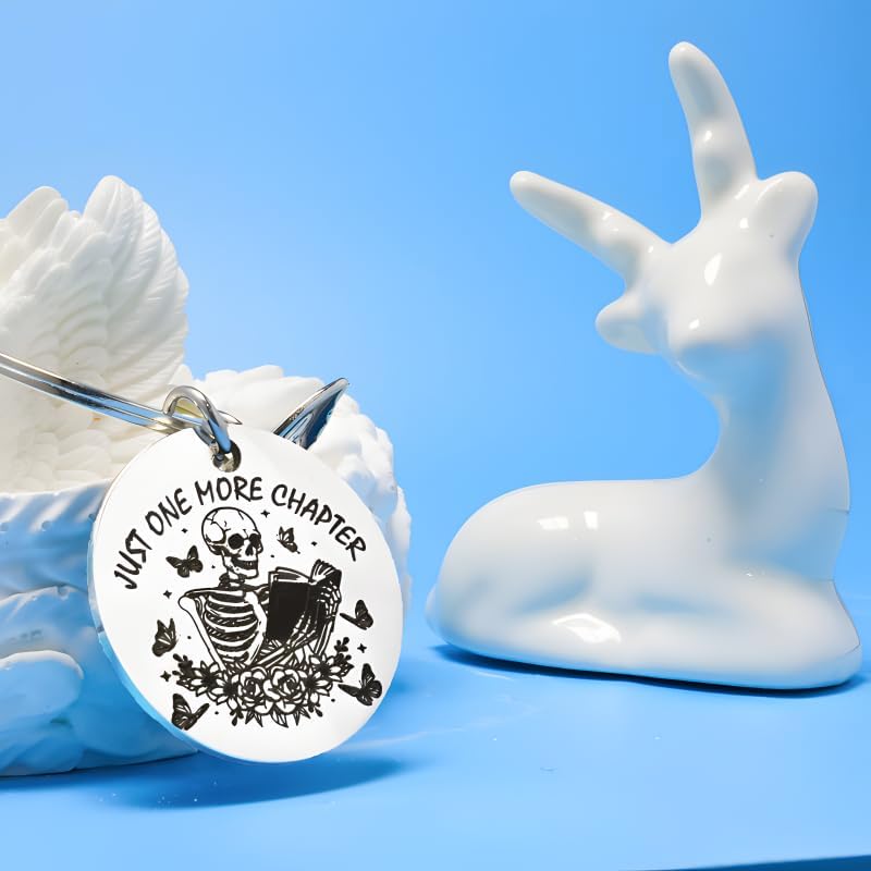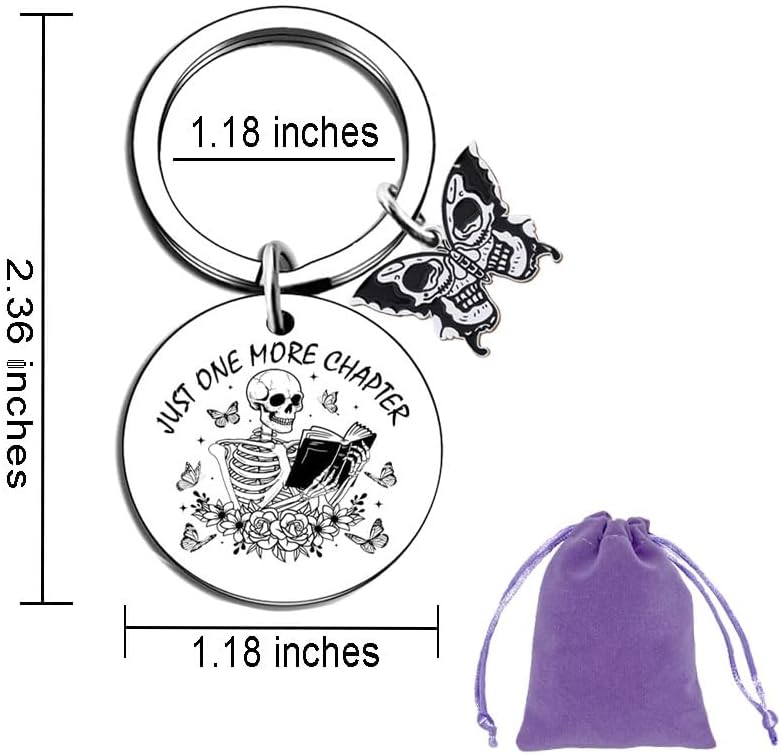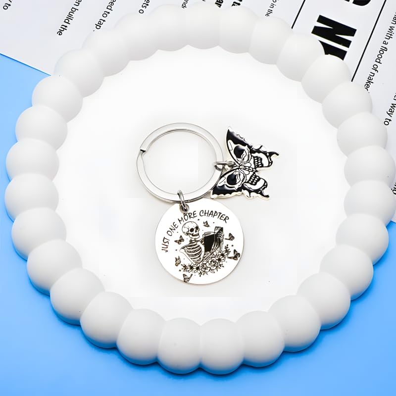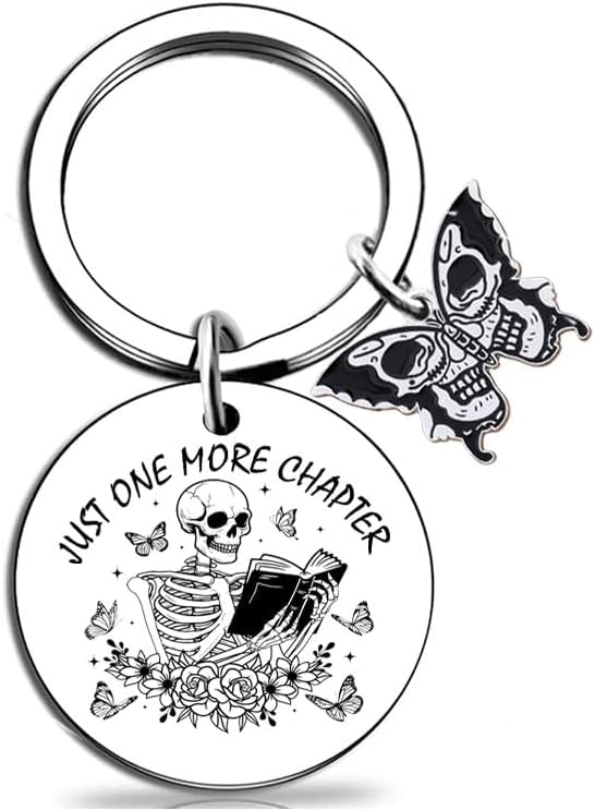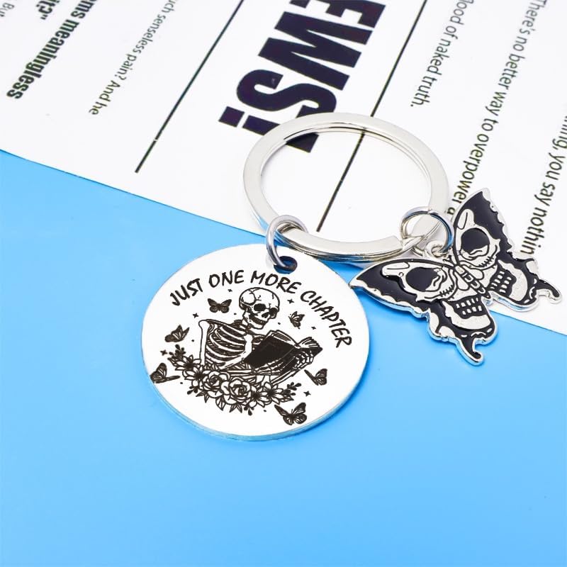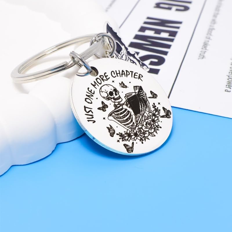 Gifts for Book Lovers: The keychain is engraved with: “Just one more chapter.”It is printed with a pattern of a skeleton opening the next page of the book.Text and image prints symbolize a love for reading that will remain steadfast until death.It showing appreciation for book lovers.