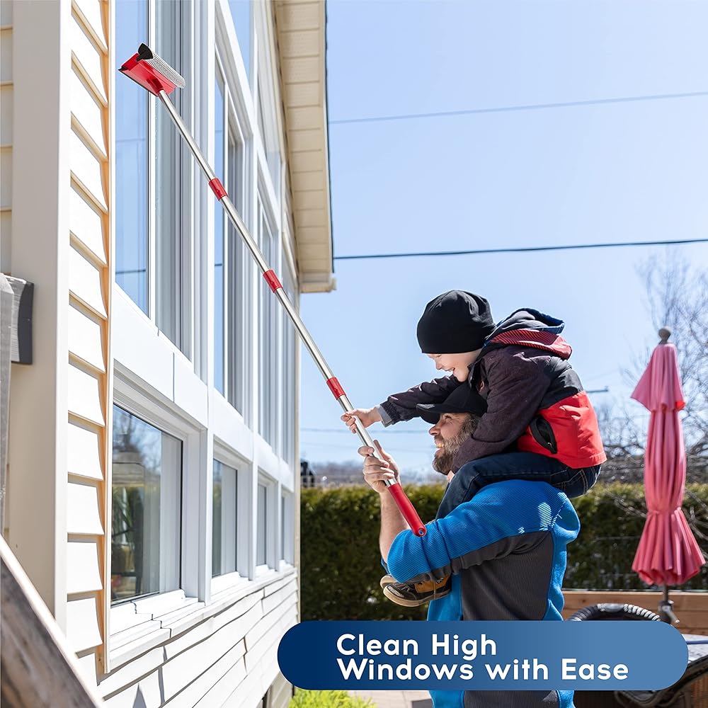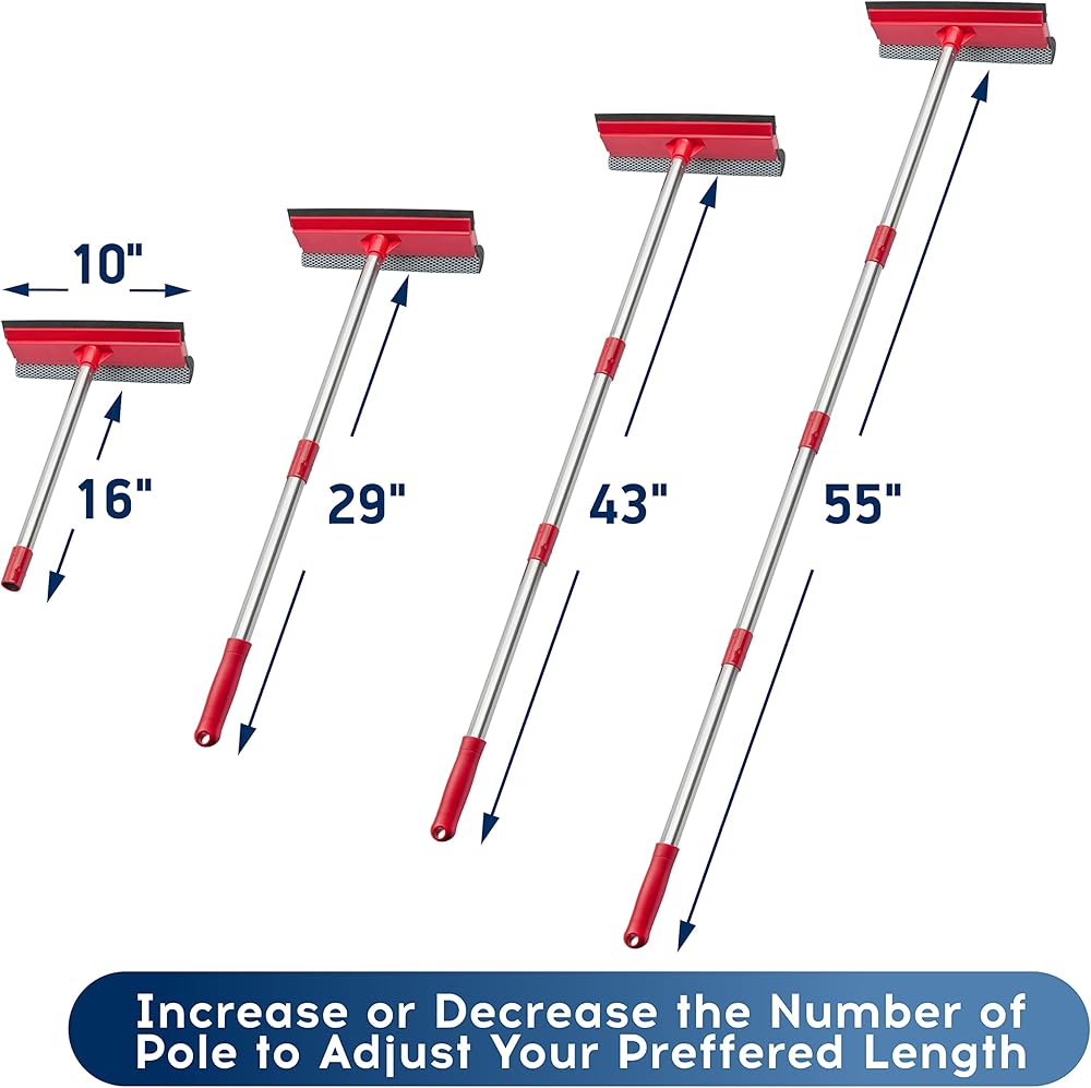 【سهلة الاستخدام】أداة تنظيف النوافذ 2 في 1 مع 4 أقسام من أعمدة التمديد، يمكنك ضبط الطول وفقًا لاحتياجاتك (من 16 انش إلى 55 انش). تتضمن ممسحة النوافذ التلسكوبية لتنظيف النوافذ جزأين: شريط مطاطي وإسفنجة عالية الجودة (10 انش). من المريح استخدام أداة التنظيف الإسفنجية لتنظيف النوافذ، ممسحة مطاطية لمسح الماء. هذه المجموعة الكل في واحد هي كل ما تحتاجه لتنظيف النوافذ وأبواب الدش وأي سطح أملس آخر بسرعة وكفاءة.