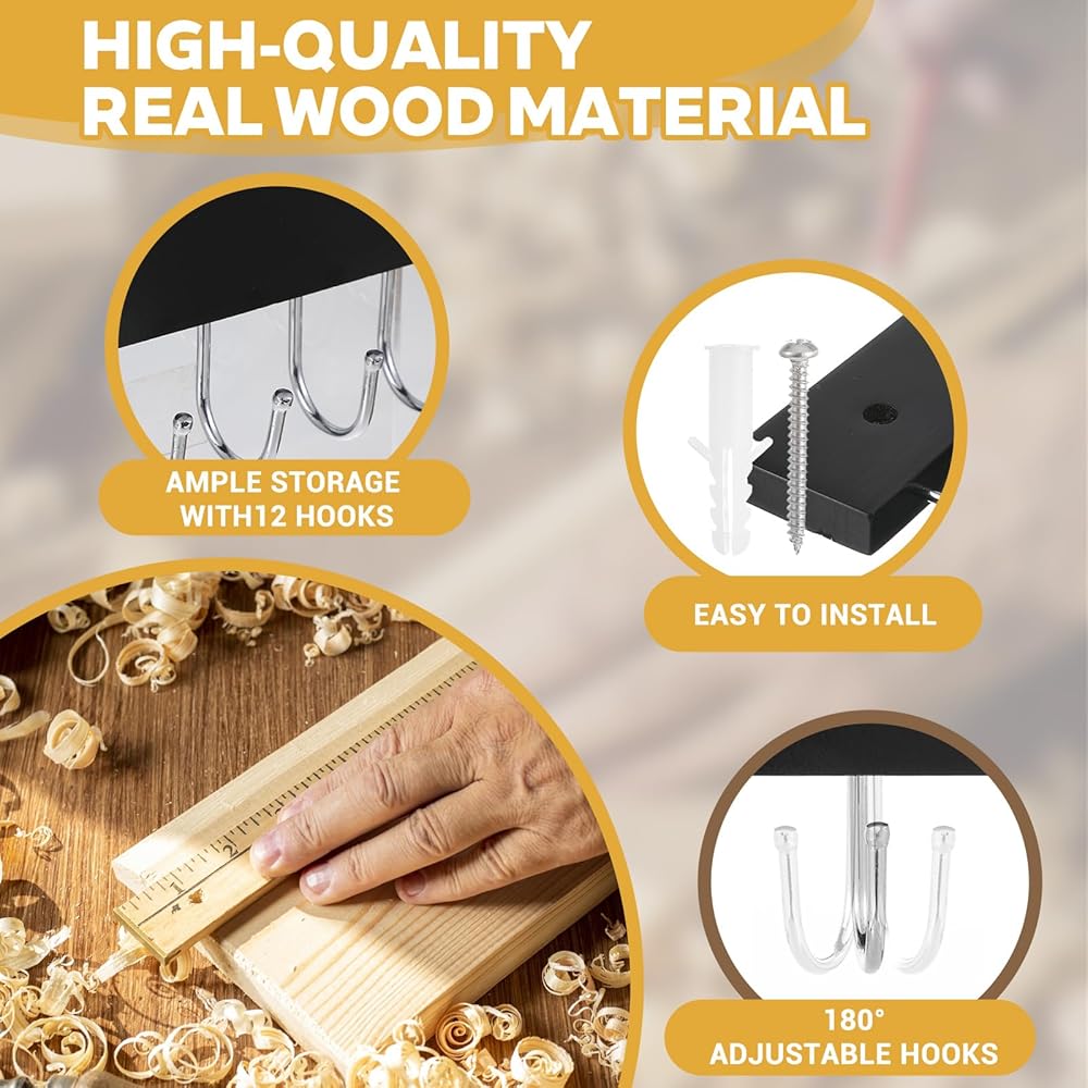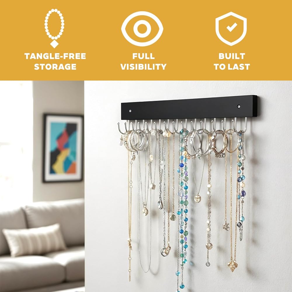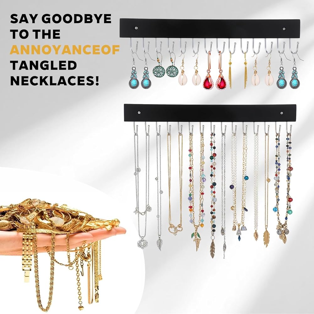 14-hook necklace hanger wall mount makes full use of storage space to store necklaces, earrings, bracelets, scrunchies, hair bands, watch straps, pendants, etc.