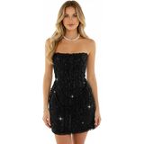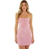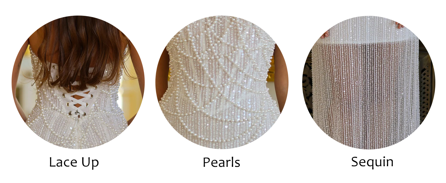 القماش: فستان الزفاف الصغير/متوسط الطول هذا مصنوع من مادة اللؤلؤ والترتر عالية الجودة، ورباط من الخلف، ومبطن بالكامل، وحمالة صدر مدمجة.