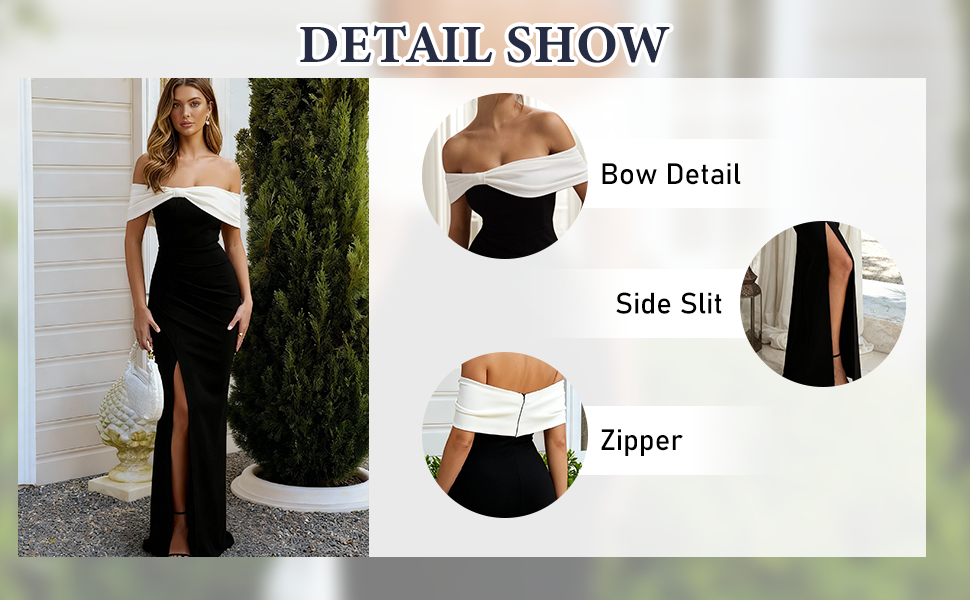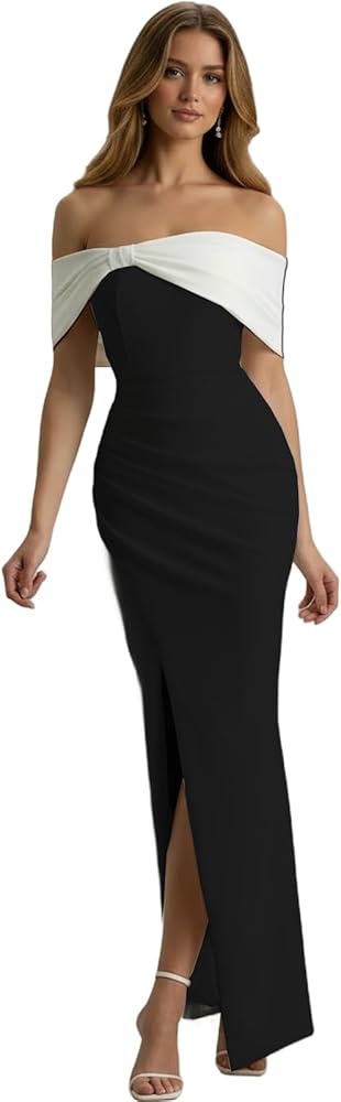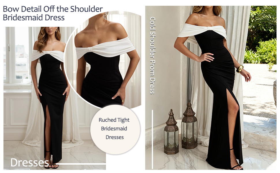 فستان أنيق مكشوف الأكتاف مع تفاصيل مكشكشة، وفتحة عند الفخذ، وفيونكة غير متماثلة. صورة ظلية للتخسيس مثالية للحفلات الموسيقية أو حفلات الزفاف أو المناسبات الرسمية. يجمع بين الرومانسية والحداثة.