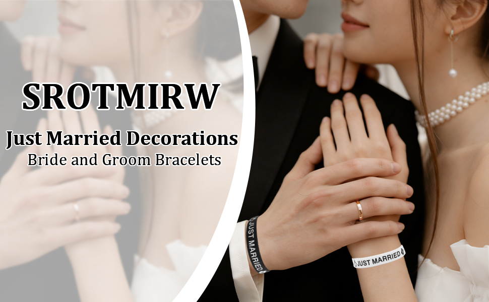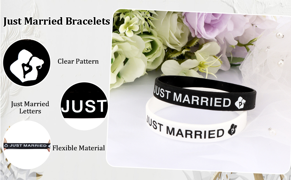 ديكورات Just Married: تتم طباعة أساور العروس والعريس بعبارة "JUST MARRIED". سواء ارتديتها في يوم زفافك أو طوال شهر العسل، تضيف هذه الأساور لمسة ممتعة وساحرة إلى كل لحظة ثمينة، مما يجعل ذكرياتك الخاصة لا تُنسى.