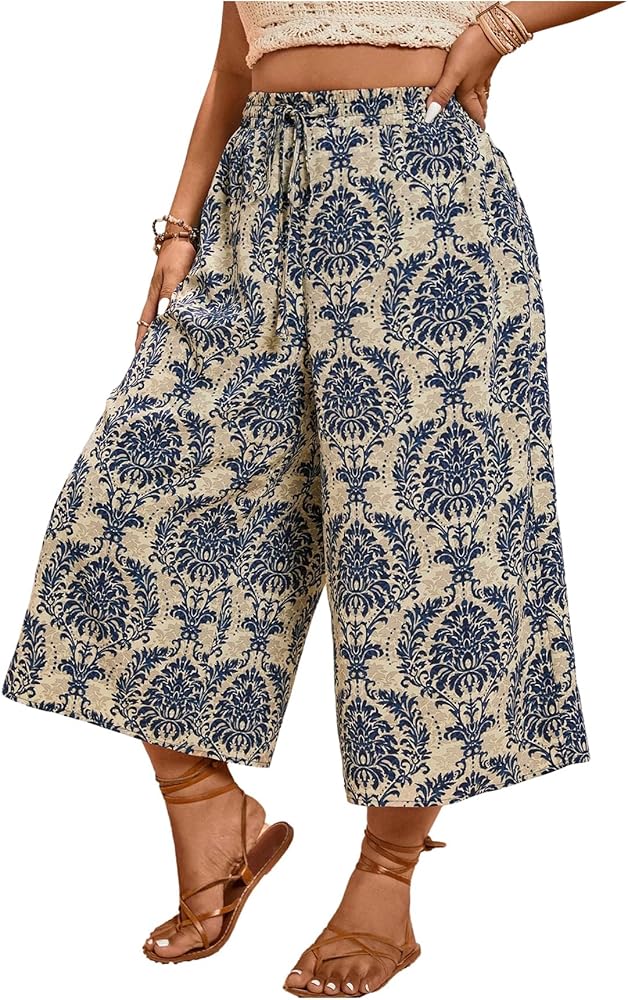MakeMeChic Women's Plus Size Boho Pants Floral Wide Leg High Waist Elastic Palazzo Pant Summer Vacation in Kuwait