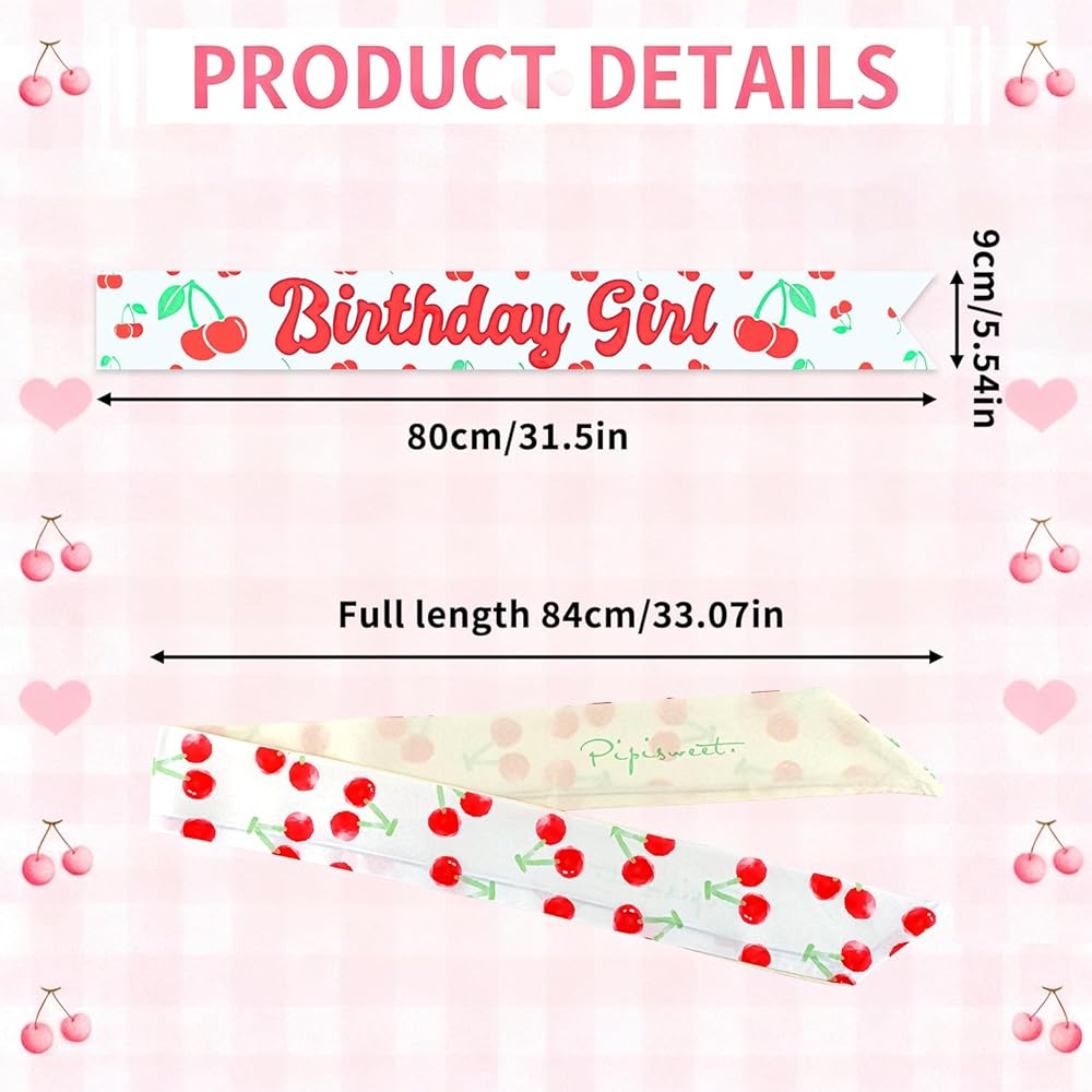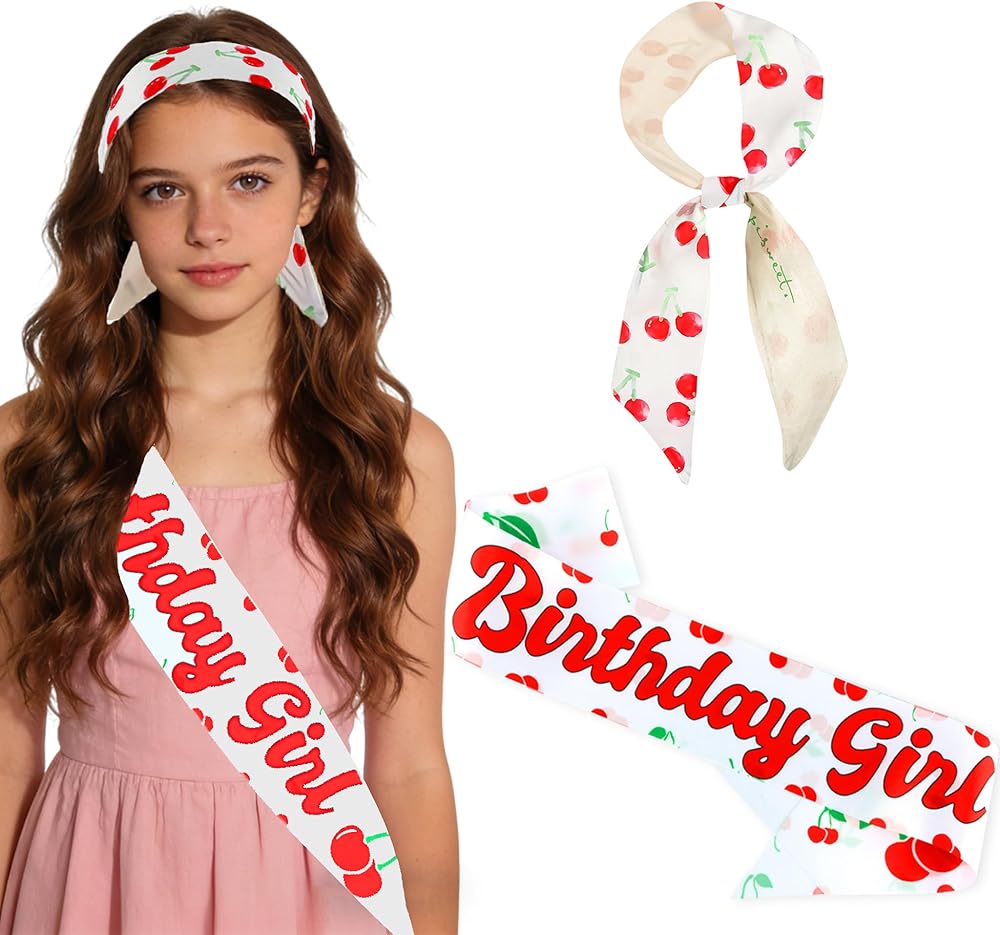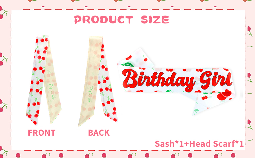 One-Size-Fits-Most Universality: The "Birthday Girl" sash is 3.5 inches wide and 62 inches long in total. The cherry headscarf measures approximately 33 inches in length, making it a flattering accessory for women and teens alike. Designed for a perfect fit.