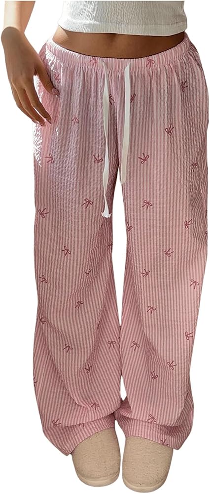MakeMeChic Women's Summer Pants Elastic Waist Y2K Bow Striped Drawstring Straight Leg Lounge Pants
