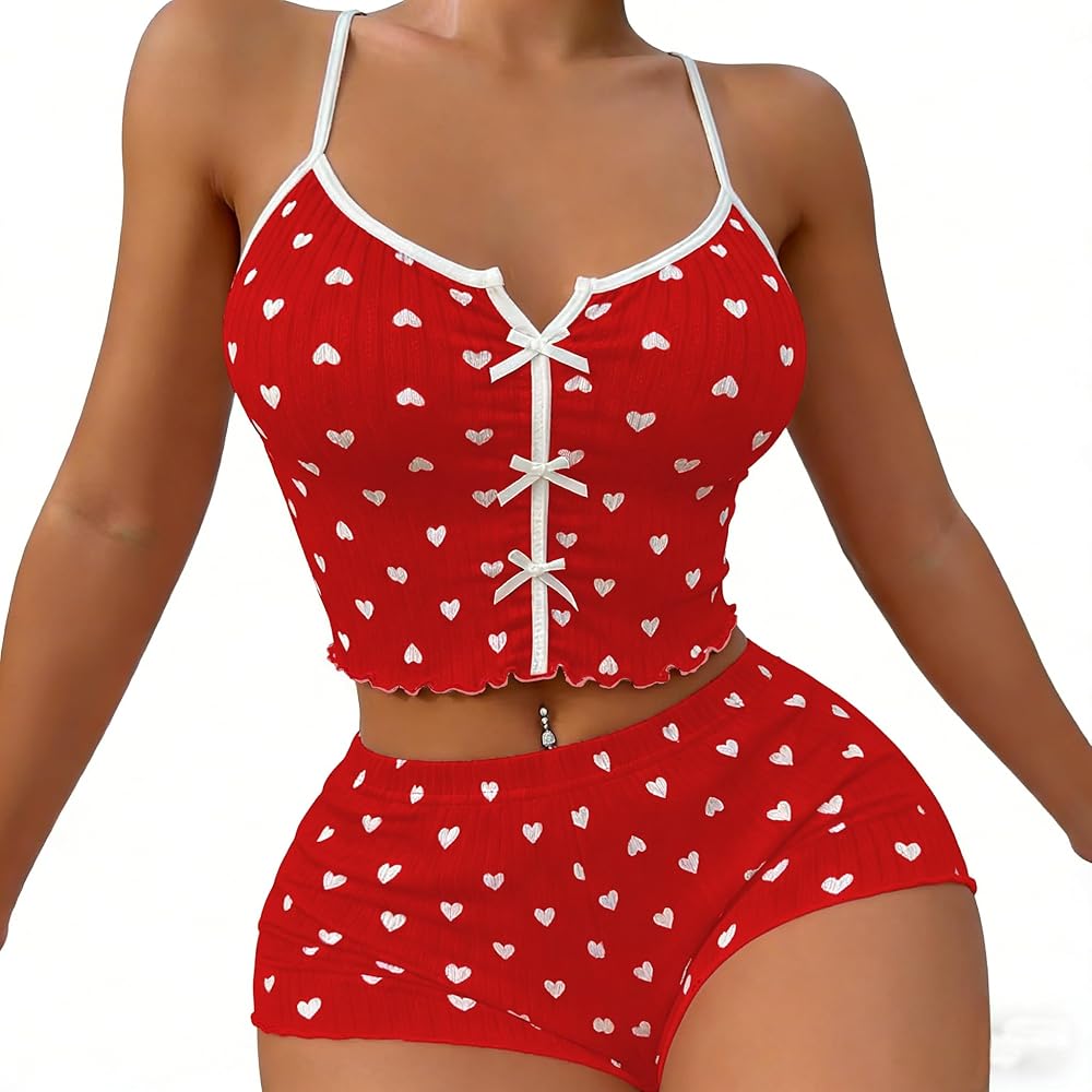 Romantic Design:Celebrate love in style! This elegant pajama set features a delicate all-over heart pattern and sophisticated lace trim on both the camisole top and shorts, creating a perfect blend of cute and sexy for an unforgettable Valentine's night or romantic getaway.