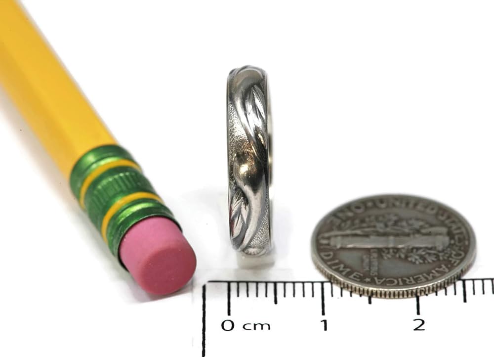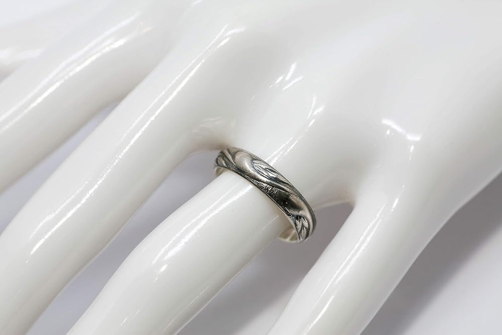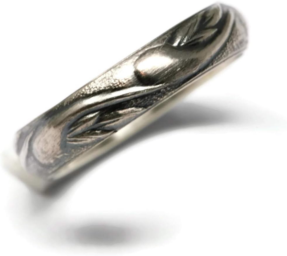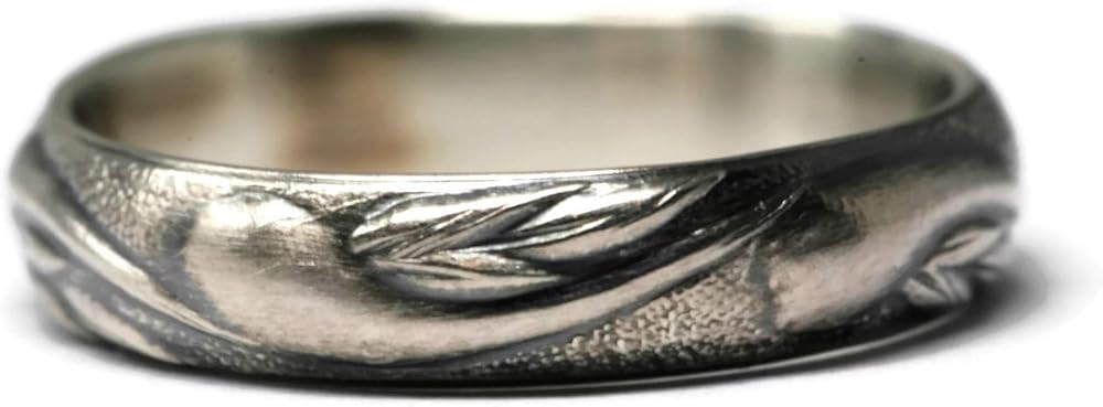 This Art Nouveau pattern band is made of 925 Sterling Silver. The band is 4.3mm wide and 1.7mm thick. Oxidized to a Vintage Silver finish. Reuseable ring sizer included.