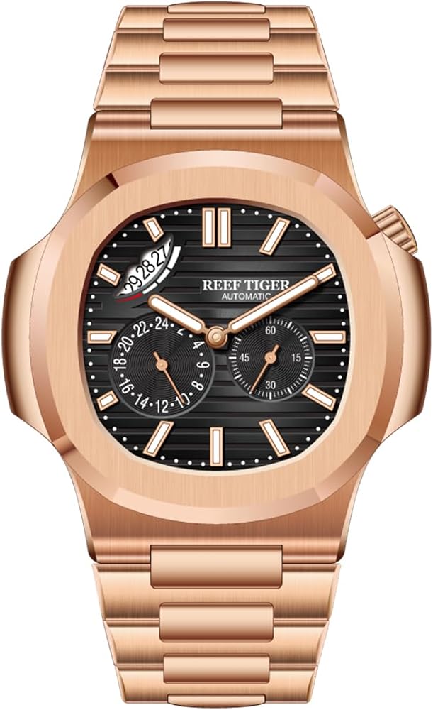 Elevate your wrist game with this stunning Reef Tiger automatic watch that masterfully combines sophistication with modern design. The striking blue dial features a unique pattern that catches light beautifully, complemented by luminous hour markers and hands for excellent visibility. The robust stainless steel case and band showcase a premium brushed silver finish that exudes luxury and durability. This timepiece includes a precision automatic movement, displaying both hours and minutes with a specialized sub-dial for enhanced functionality. The watch's elegant design is perfectly balanced with its sporty elements, making it versatile enough for both formal occasions and daily wear. The integrated bracelet design flows seamlessly from the case, ensuring both comfort and style. With its distinctive octagonal case shape and high-quality construction, this Reef Tiger watch stands as a testament to fine watchmaking craftsmanship.