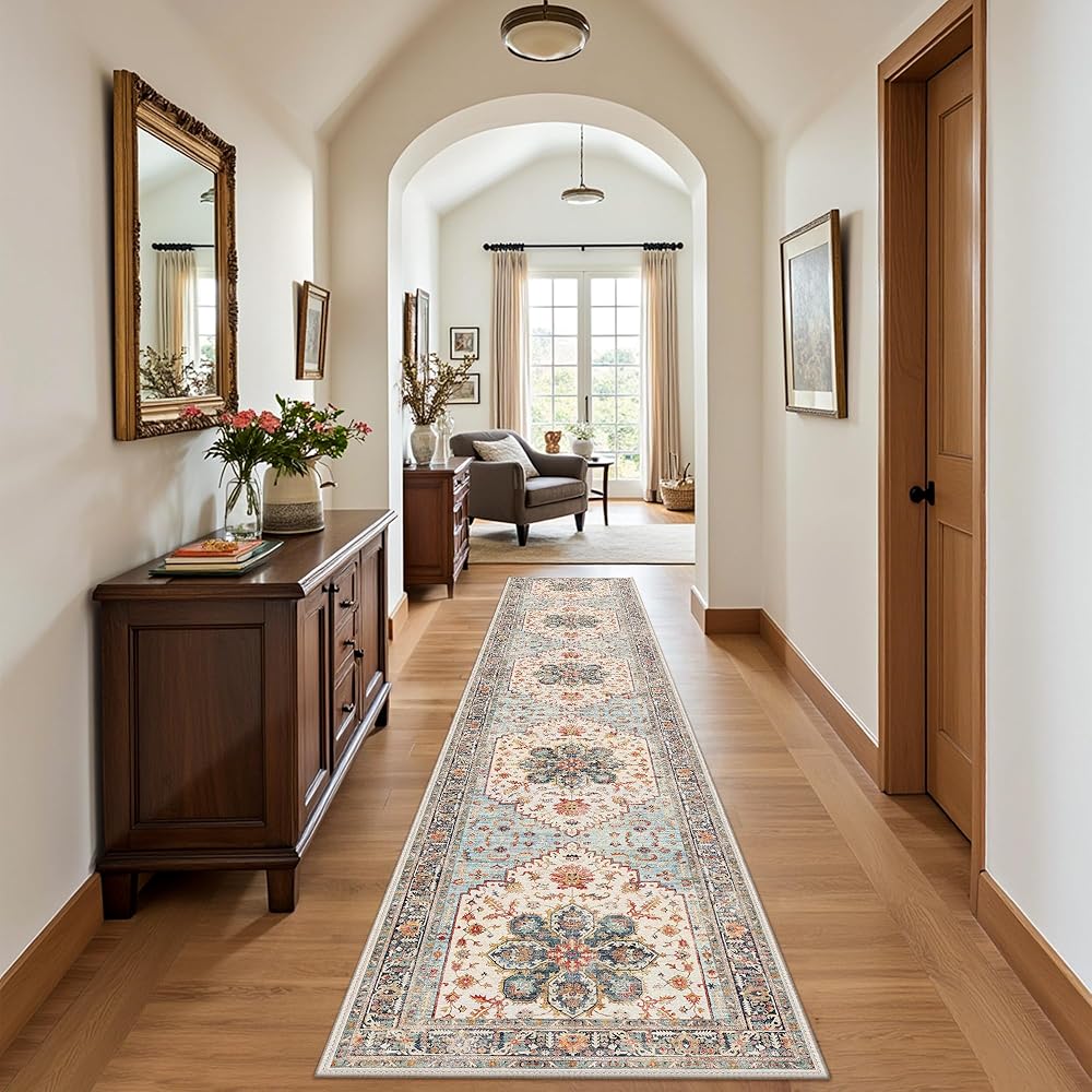 ظهر مانع للانزلاق: سجادة عداء مقاس 2'6'' x 8' مصنوعة من البوليستر ومجهزة بظهر مطاطي TPE، وتبقى سجادات الممرات غير القابلة للانزلاق في مكانها بشكل آمن على الأرضيات الصلبة والبلاط، مما يوفر بيئة آمنة ومريحة في المنزل