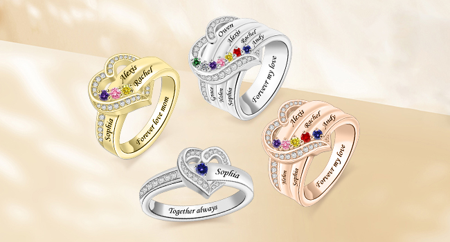 【How to Get】1-Choose the number of birthstones; 2-Click "Customize Now"; 3-Type the text. Each ring has classic and elegant silver, gold and rose gold.