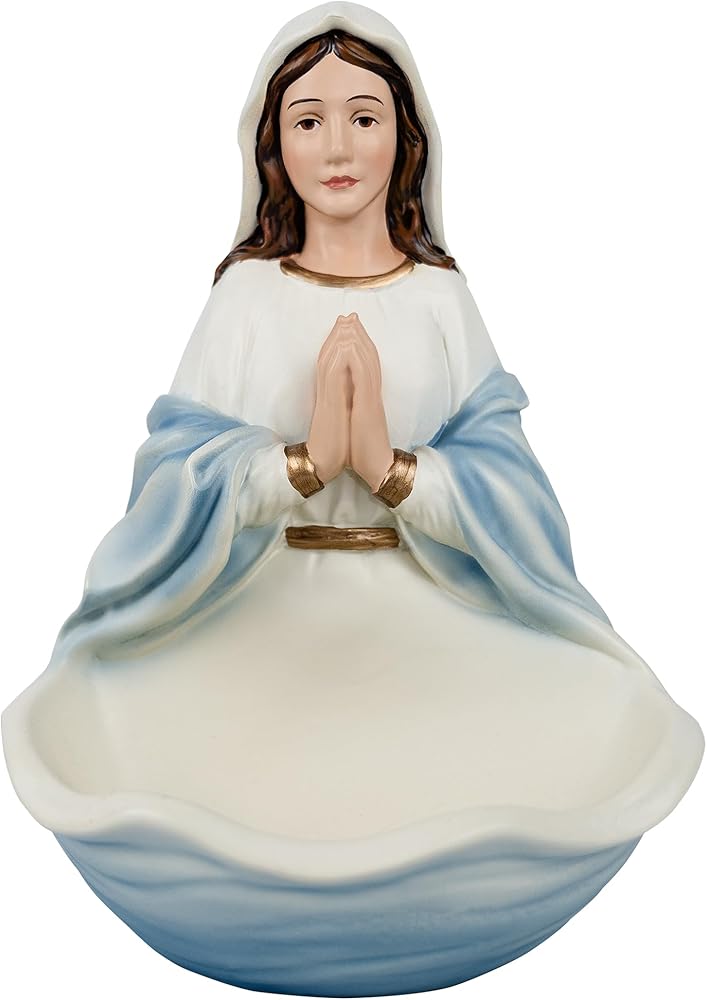 حامل مسبحة مريم: احتفظ بخرز المسبحة الخاص بك في مكان خاص مع تمثال حامل المسبحة الجميل هذا. يعرض تمثال مريم العذراء الصغير هذا بشكل جميل الصورة الأنيقة لمريم العذراء. يتميز بوعاء بقطر 10.16 سم يحمل المسابح أو الأشياء الصغيرة بشكل آمن، مما يجعله جميلاً وعمليًا.