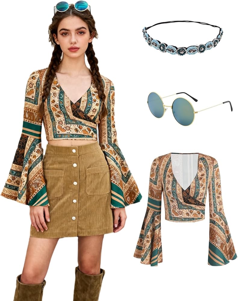 Step back into the groovy 70s with this complete Women's Hippie Costume Set, designed to give you an effortless retro transformation. Whether you're headed to a 70s-themed party, disco night, Halloween event, retro birthday, or music festival, this outfit captures everything customers love about the classic flower-child look. The standout feature is the bell sleeve printed boho blouse, crafted with vibrant psychedelic patterns and wide flowing sleeves that instantly bring 70s fashion to life. It's lightweight, breathable, and comfortable enough for dancing, posing, or partying all night long. To complete your look, the set includes hippie hair accessories and jewelry, such as a colorful headband and peace-sign pieces that add authenticity and charm to every outfit. No need to buy extra items—you get the full 70s vibe straight out of the package. Perfect for women wanting an easy, ready-to-wear costume, this set works for festivals, school dress-up days, themed office events, group or couple costumes, or anyone wanting a fun and stylish retro moment. Slip it on, accessorize, and get ready to spread peace, love, and groovy energy wherever you go.