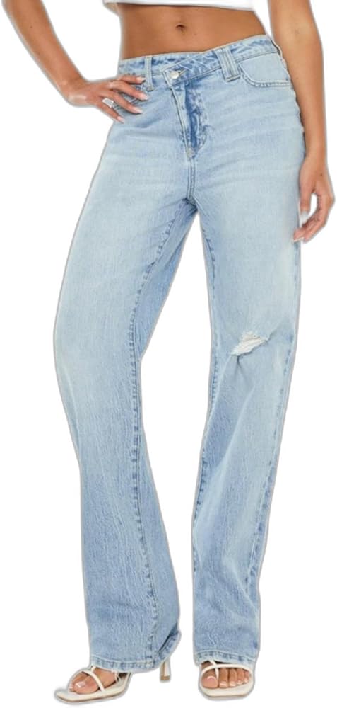 The distressed high-rise straight-leg jeans are modern. Wear it with a simple top or a stylish coat for a trendy and comfortable look. Whether you're paired with sneakers or heels, you'll be confident and individual. Perfect for every occasion, you'll always be in style.