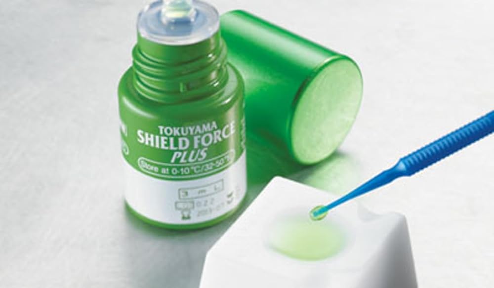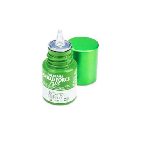 Shield Force Plus Light-Cured Desensitizer - Refill: 3ml Bottle. Features proven "doubleblock" technology that deeply seals the dentin tubules for immediate pain relief, and produces a high-wear coating that prevents the loss of dentin due to abrasion or erosion. Goes on green for good visibility during placement, then light cures clear.