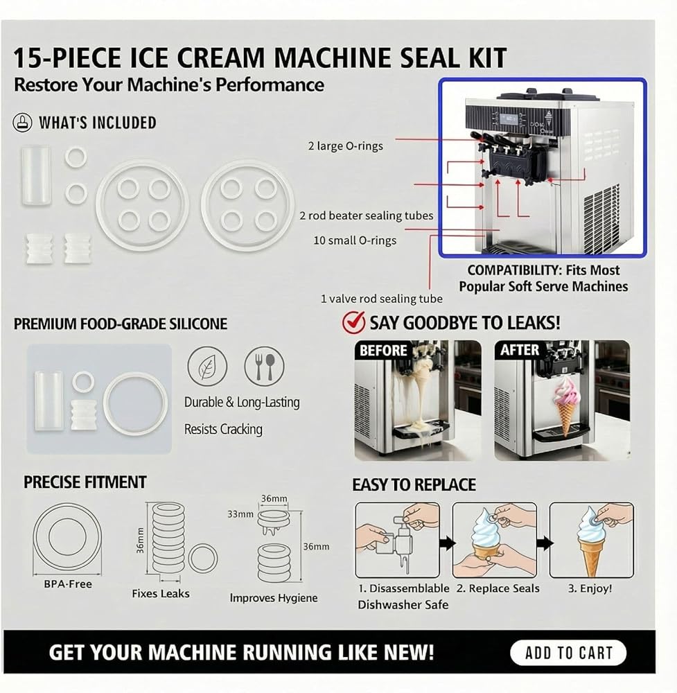 طقم إصلاح ماكينة الآيس كريم الناعم المكون من 15 قطعة - حلقات دائرية وحشوات وأختام وأنابيب لـ VEVOR، YIKAFU | سيليكون ممتاز من الدرجة الغذائية، مقاوم للتسرب، سهل التركيب للاستخدام التجاري والمنزلي
