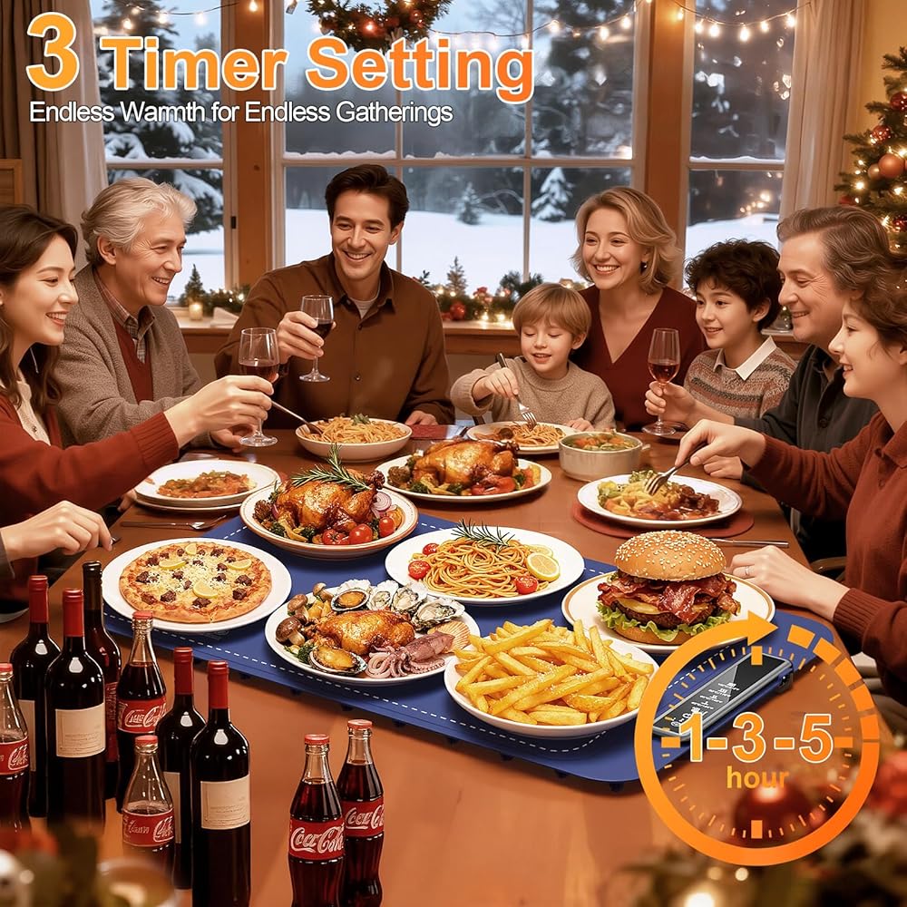 【4 مستويات لدرجة الحرارة و3 إعدادات للتوقيت】يمكن أن تلبي إعدادات درجة الحرارة الأربعة لبساط تسخين الطعام احتياجاتك المختلفة لتسخين الطعام. صواني التدفئة لحفلات البوفيهات مزودة بـ 3 وظائف توقيت، مما يسمح لك بالتعامل مع الأعمال المؤقتة براحة البال أو انتظار الأصدقاء لمشاركة الطعام اللذيذ معًا. يمكن لسجادة تدفئة الطعام أن تحافظ على الطعام دافئًا وطازجًا، مما يجعل تجربة تناول الطعام الخاصة بك أكثر متعة لأنه يمكنك تناول الطعام بشكل جيد بدلاً من تناول الطعام بسرعة.
