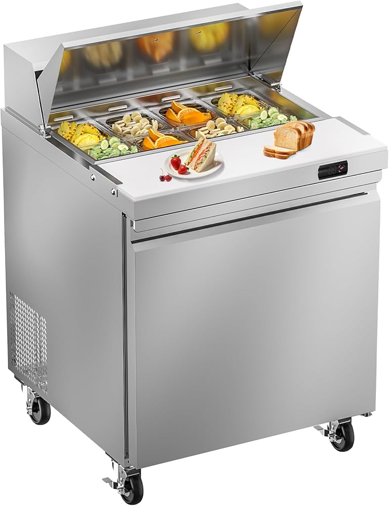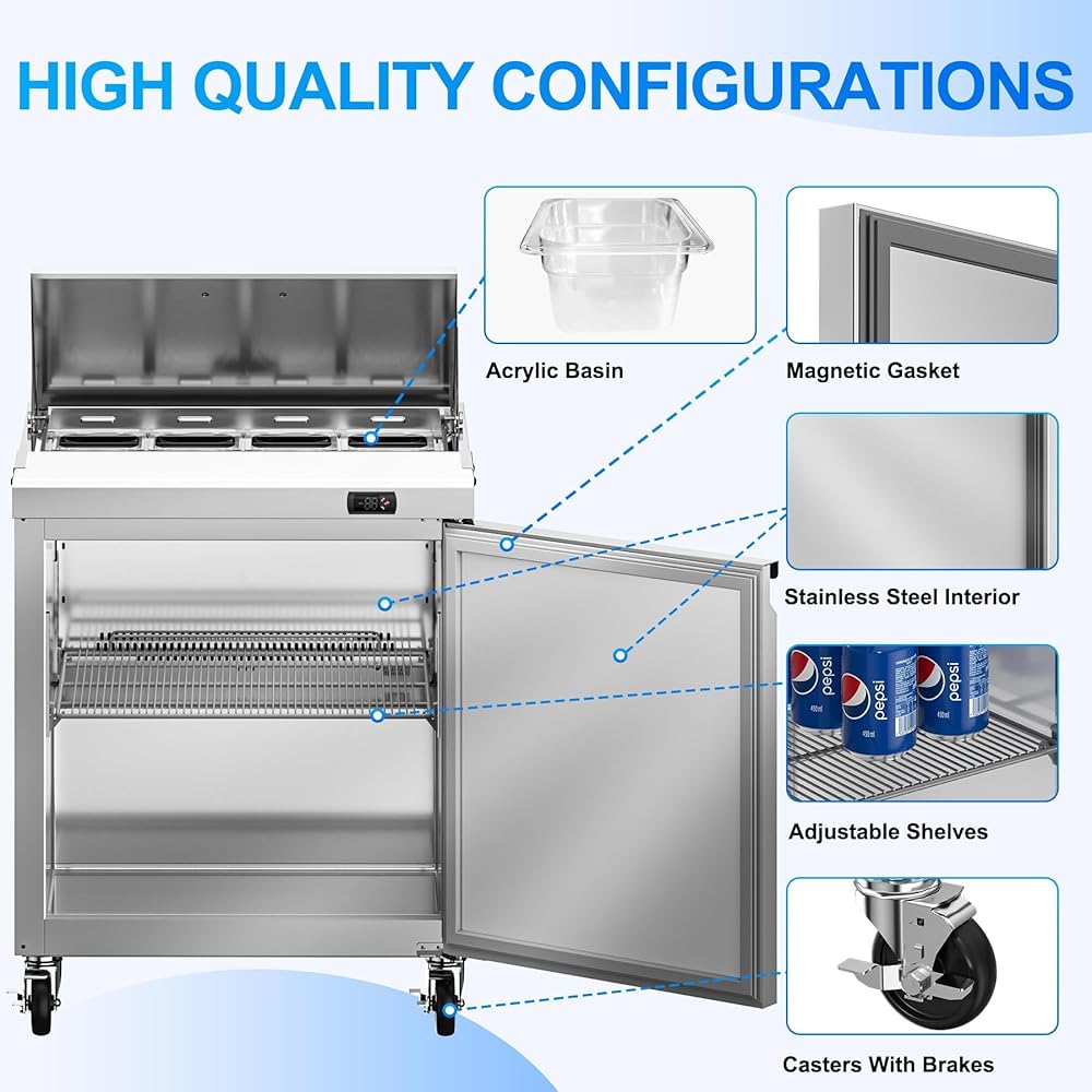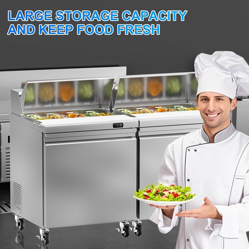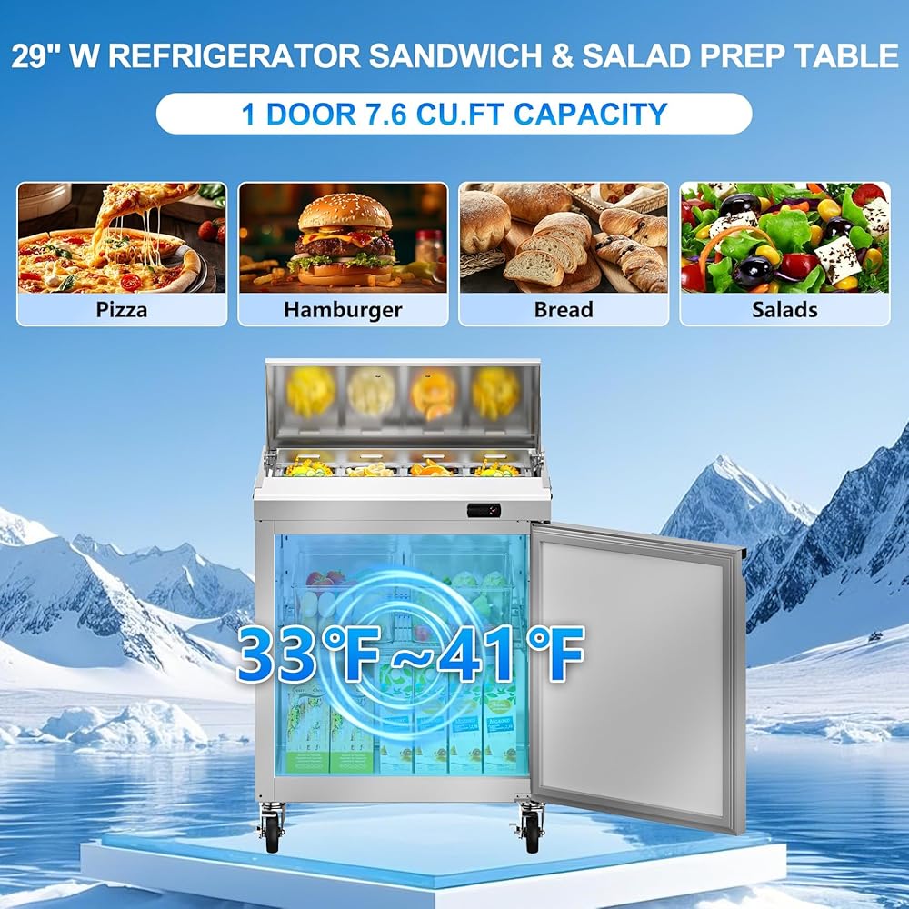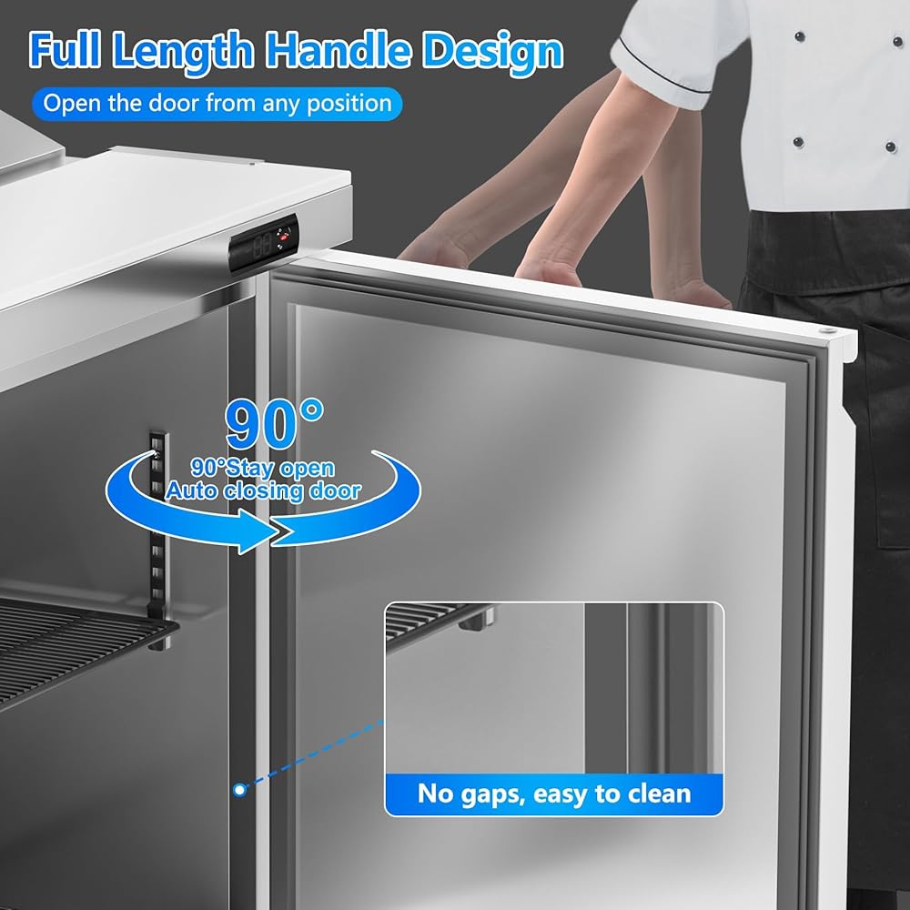 • User-Friendly Commercial Design: The 29" W sandwich prep table refrigerator use full-length door handle, easy opening and closing, even in high-traffic kitchen environments. The auto-close door mechanism ensures the door closes automatically when opened angle less than 90 degrees, preserving energy, while it remains open beyond 90 degrees for convenient access during food preparation