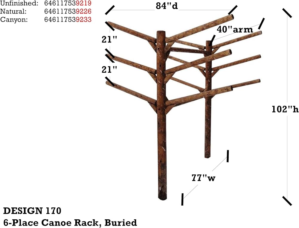 The 6-place Kayak/Canoe/SUP Rack is built with Northern White Cedar from the Upper Peninsula of Michigan. This rack is meant to be buried in the ground approximately 36" deep. This rack is designed for functionality and aesthetics by lake homeowners. It not only cares for and organizes your boats, but it can also be matched to its surroundings being log construction. With finishing options, you can match dock, house, etc... or let it turn silver/gray with no finish, or you can use your own finish if so desired. This rack holds the heaviest of Canoes, Surfboards, kayaks, and SUPS (Stand Up Paddleboards). Each boat can weigh up to 100 pounds. This rack has up to a 600-pound capacity. We have worked with logs for over 23 years crafting log homes, furniture, and kayak racks. Each joint is glued and screwed for longevity. We use glued mortise-and-tenon joinery wherever possible. Hand made and finished by Log Artisans in Northern Wisconsin.