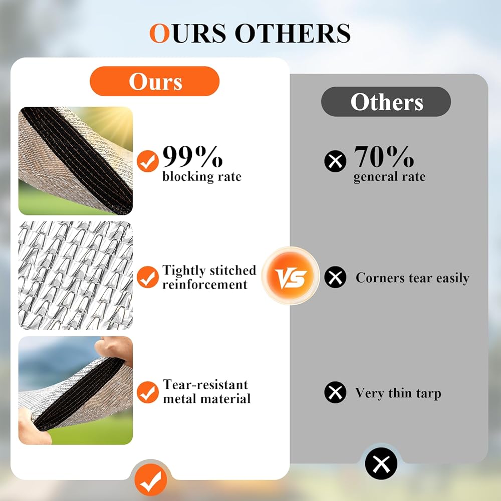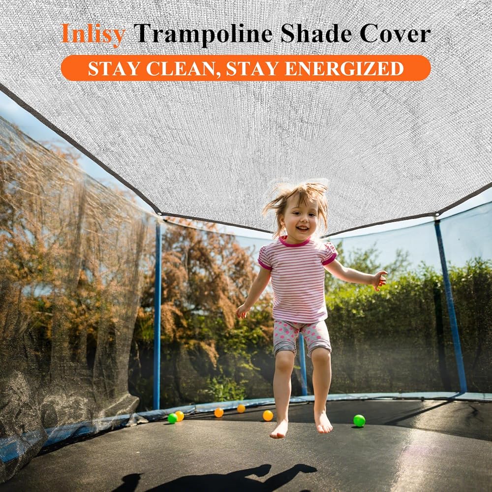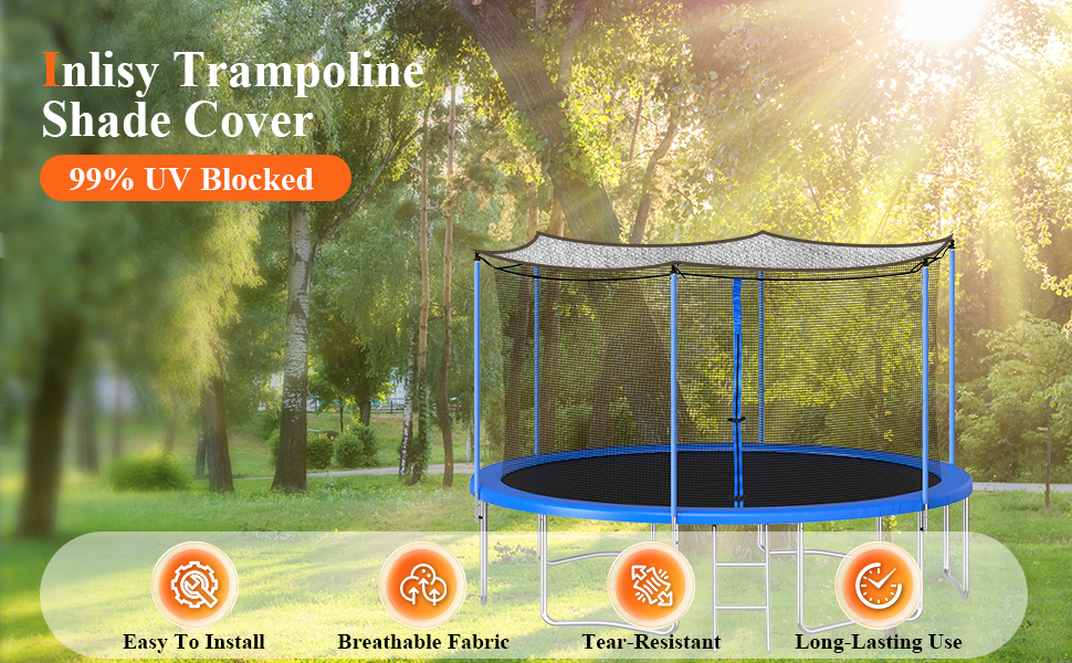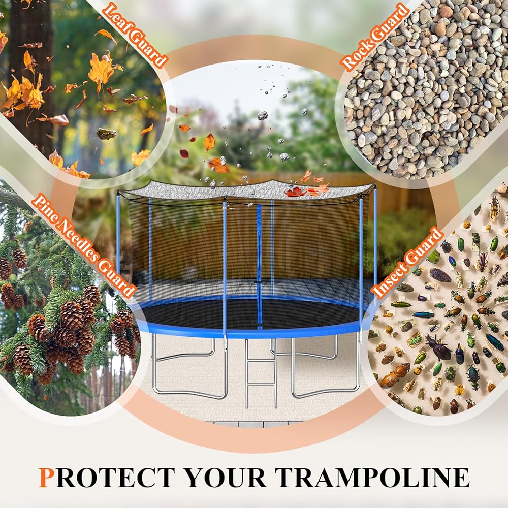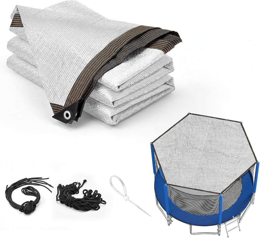 99% BLOCKING RATES : The full-coverage aluminium foil texture offers chill shade, blocking 99% of sunlight rays. Trampoline Shade Cover keeps the trampoline clean during seasons when leaves and debris fall and protects children from sun exposure and heatstroke.