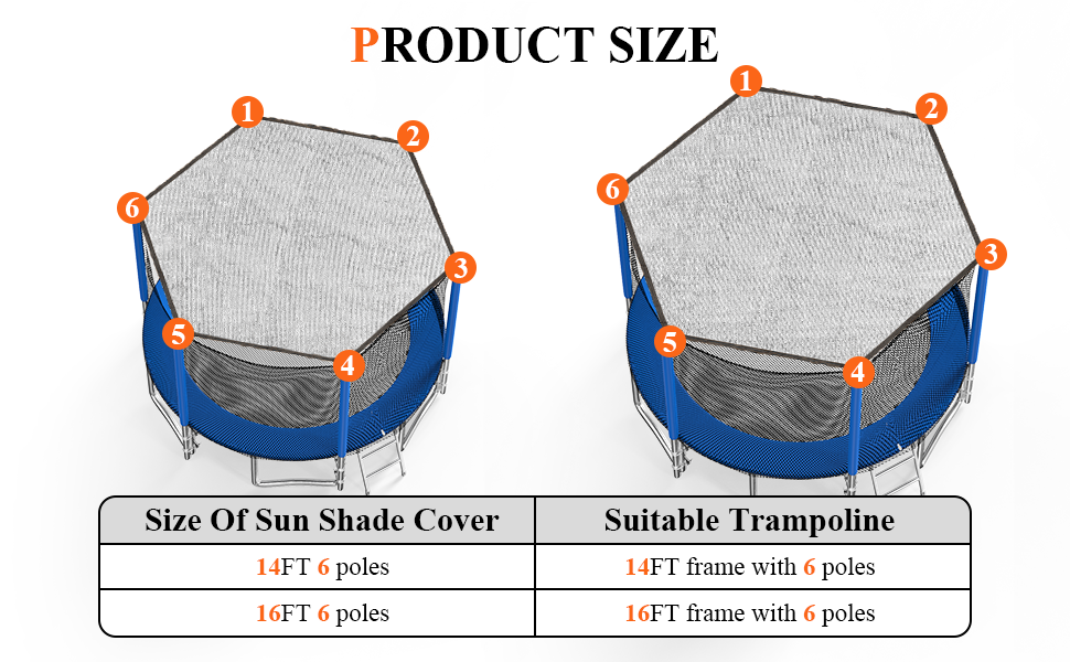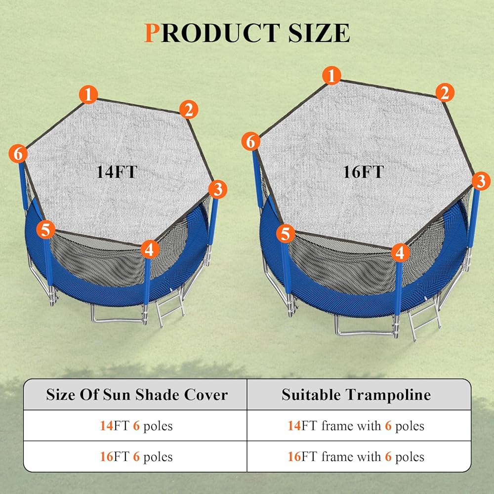 SIZE : Trampoline Cover is designed explicitly for 14-16FT round trampolines with 6 poles. For full sunshade coverage, our size is larger than standard. If your trampoline is small and the top pole is flexible and may deform, please ensure your trampoline size is slightly larger than recommended, or opt for a smaller tent.