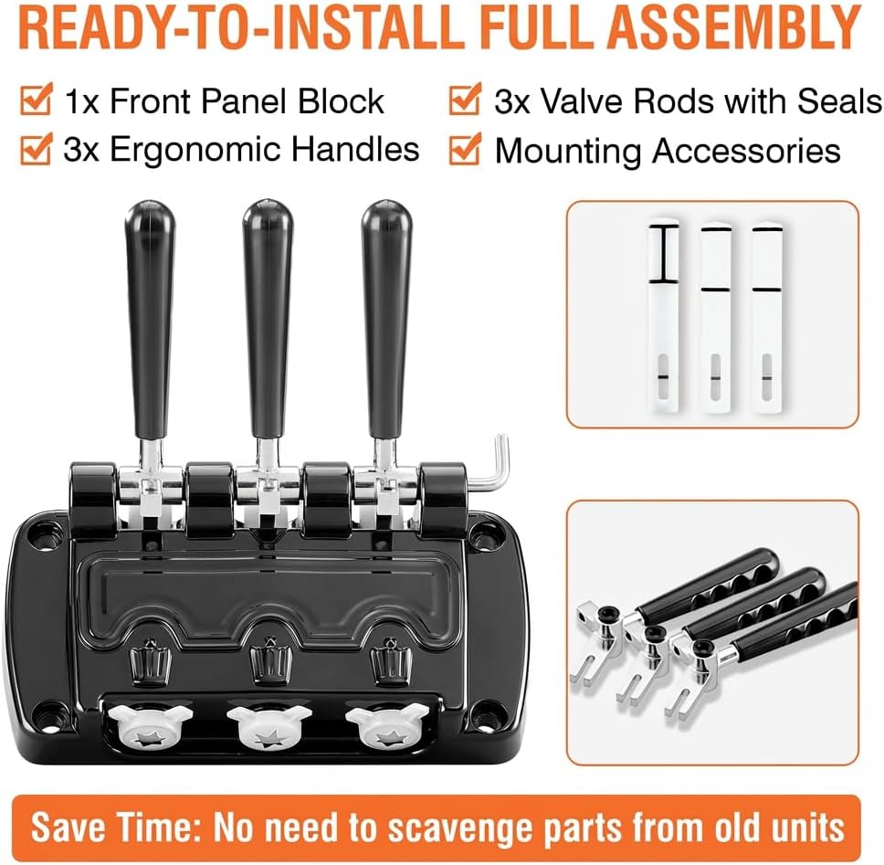 رأس توزيع كامل ذو 3 مقابض: هذه وحدة صمام تفريغ مجمعة بالكامل وجاهزة للتركيب الفوري. تشتمل المجموعة على كتلة اللوحة الأمامية، و3 مقابض توزيع، وقضبان صمامات داخلية (مكابس)، وأختام حلقية مثبتة مسبقًا. لا داعي لاستخراج أجزاء من وحدتك القديمة - ما عليك سوى التبديل والتوزيع