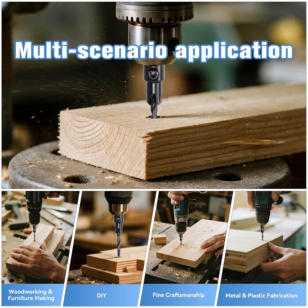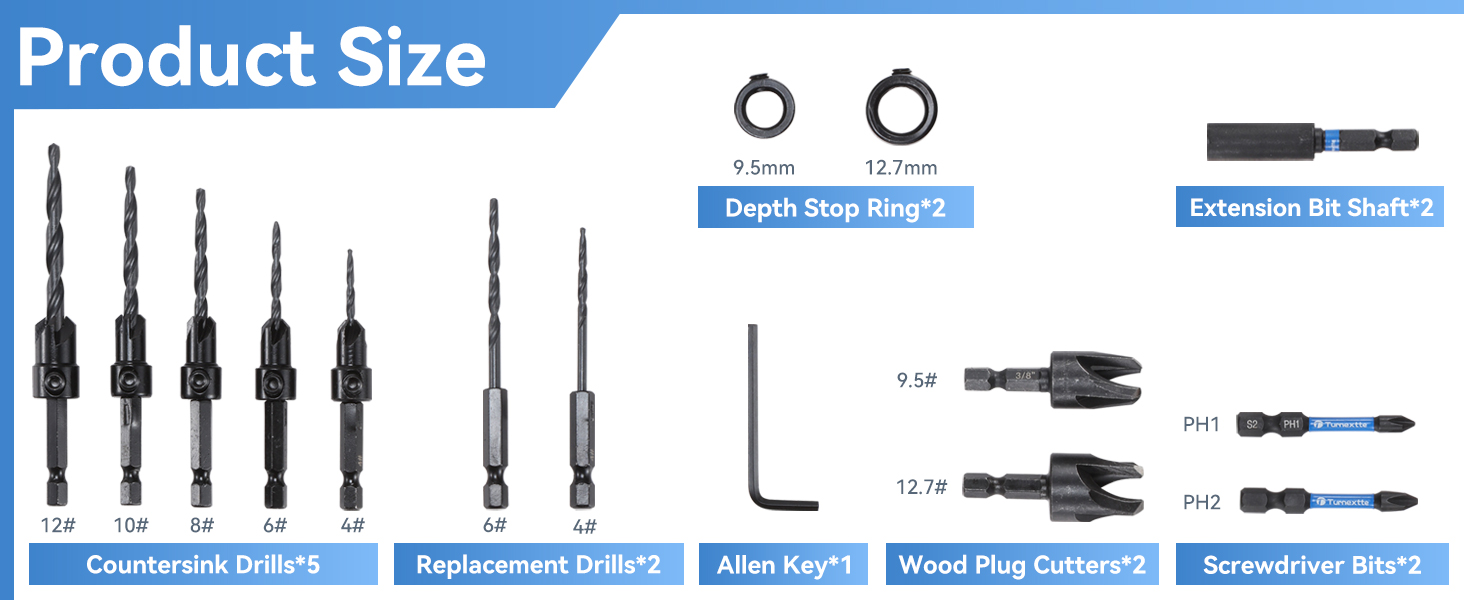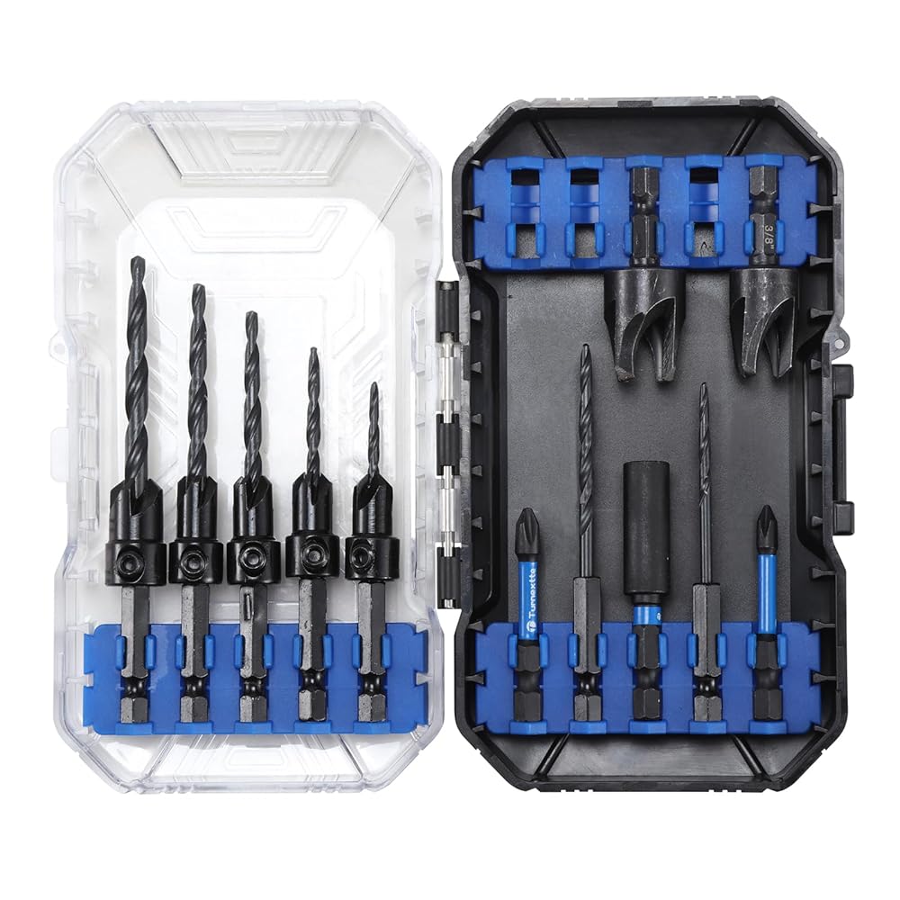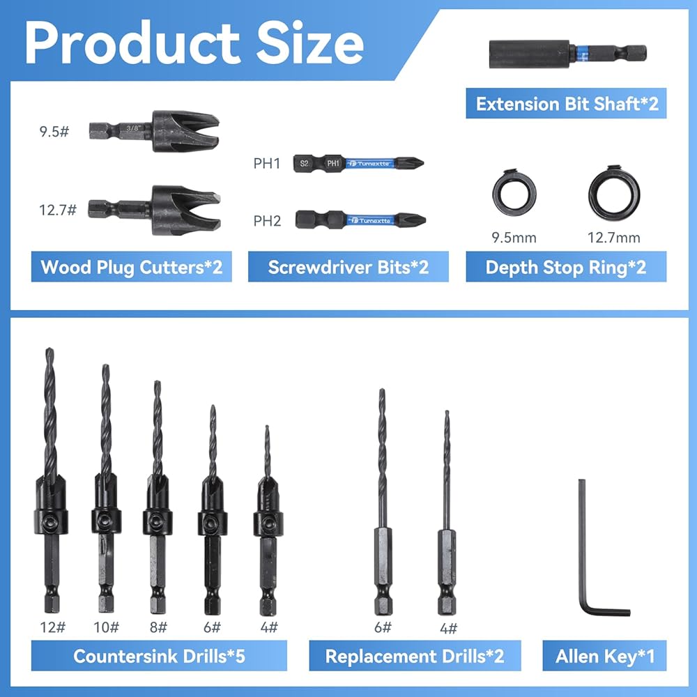 تشتمل مجموعة رؤوس المثقاب الغاطسة هذه على 7 رؤوس مثقاب مدببة (2 قطعة #4، 2 قطعة #6، #8، #10، #12)، 2 قاطعة سدادات خشبية (3/8 بوصة، 1/2 بوصة)، 2 لقمة مفك فيليبس (PH1، PH2)، حلقتين لإيقاف العمق (3/8 بوصة و1/2 بوصة)، 1 عمود لقمة تمديد، و1 مفتاح ألين. يتم تنظيم كل شيء في حقيبة متينة ومحمولة مع ملحق مُلصق لسهولة التعرف عليه وتخزينه.