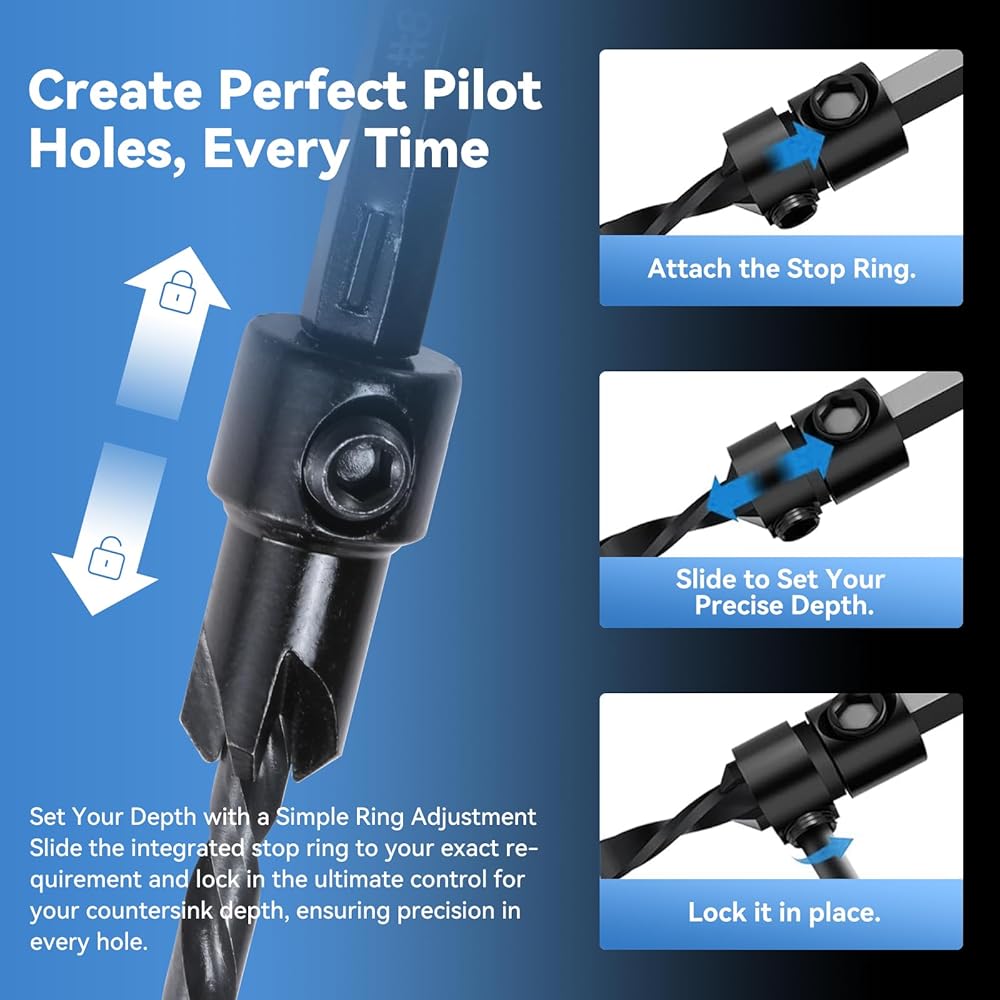 يتميز بياقة إيقاف عمق غير قابلة للانزلاق وقابلة للتعديل بشكل دقيق والتي يتم تثبيتها بشكل آمن في مكانها بحلقة دائرية عالية الإمساك. يضمن عمق حفر ثابتًا في جميع مشاريعك. تسمح الساق السداسية مقاس 1/4 بوصة بإجراء تغييرات سريعة وتتوافق مع جميع المثاقب اليدوية القياسية ومحركات المثقاب ومكابس المثقاب.