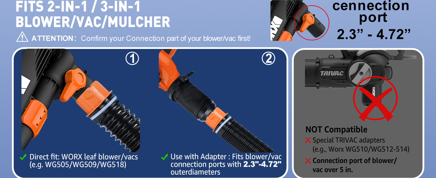 التوافق مع نماذج منفاخ الأوراق/المكنسة الكهربائية: يناسب منافذ توصيل منفاخ الأوراق/الفراغ من القطر الخارجي 2.3 بوصة إلى 4.72 بوصة. وهو متوافق تمامًا مع موديلات WORX WG505، وWG509، وWG518، بالإضافة إلى وحدات منفاخ أوراق الشجر/التفريغ/المنشرة ذات العلامات التجارية الكبرى. ملاحظة: لا يدعم الموديلات التي تتطلب محولات TRIVAC خاصة، مثل Worx WG510، أو WG512، أو WG513، أو WG514. تحقق من حجم منفذ جهازك قبل الشراء