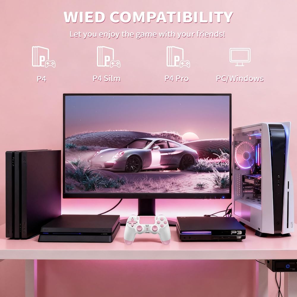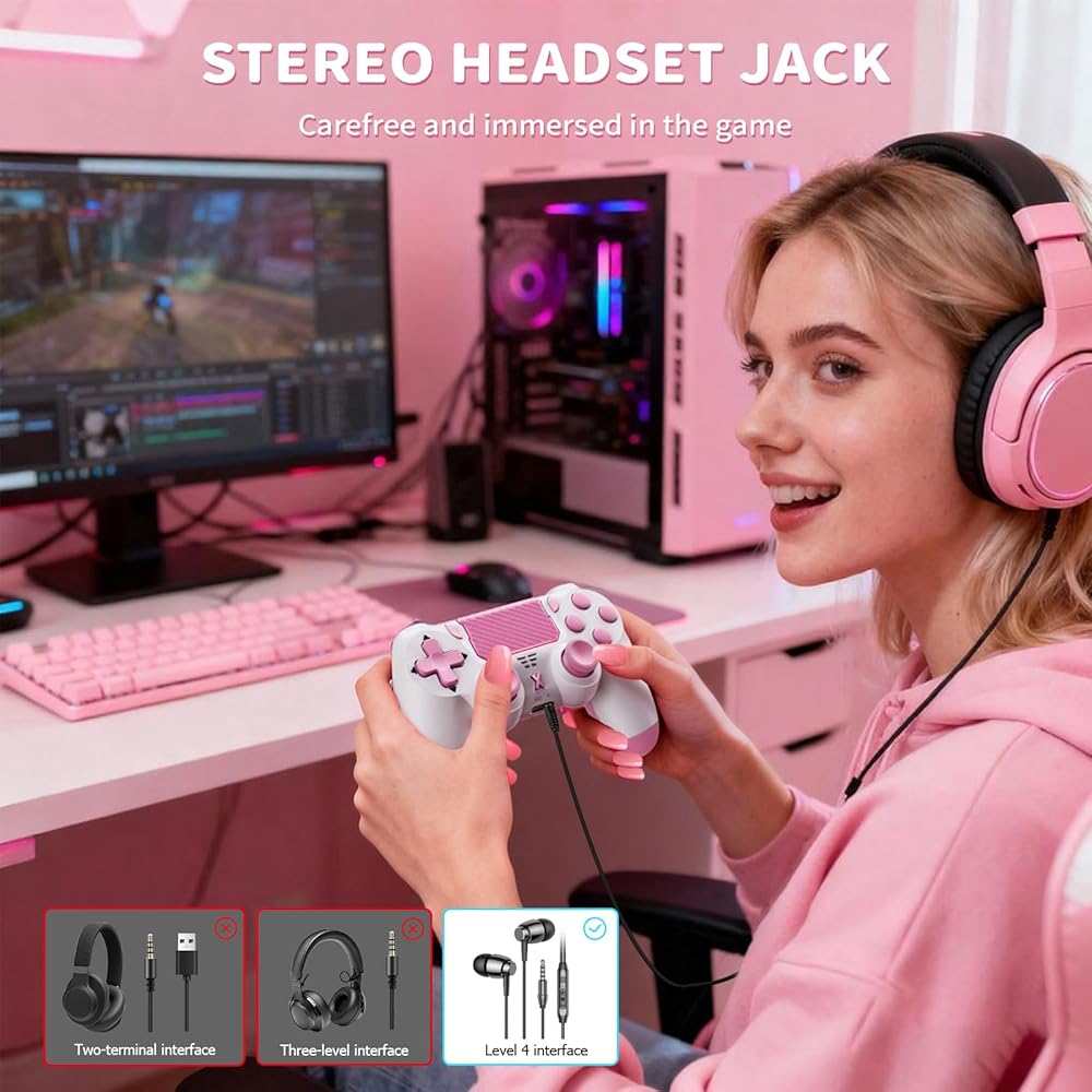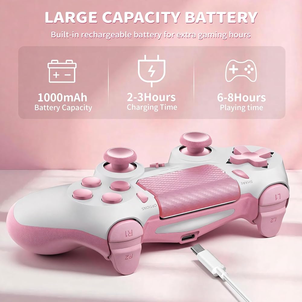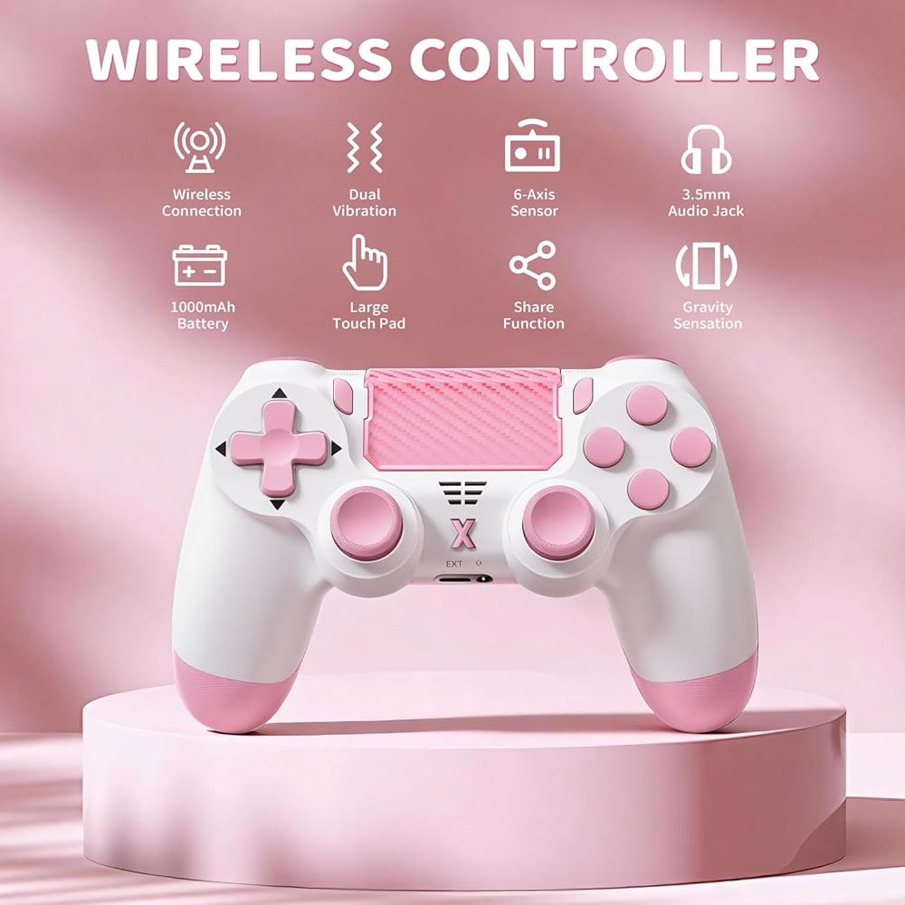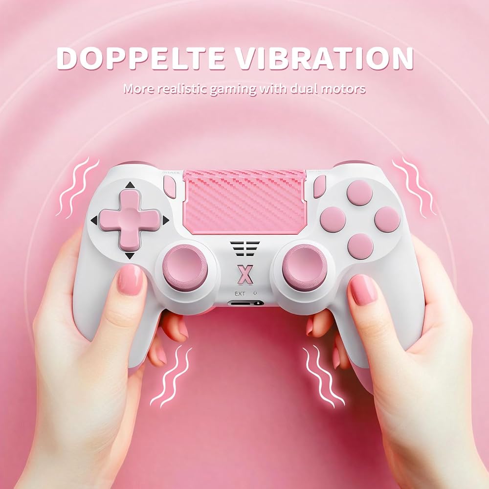 وحدة تحكم Quevati اللاسلكية لجهاز PS-4، عصا تحكم لعبة اهتزاز مزدوجة/استشعار الحركة/لوحة اللمس/مكبر صوت/سماعة رأس مقبس صوت 3.5 مم، مستشعر ستة محاور مطور، متوافق مع وحدة تحكم PS4/Slim/Pro/الكمبيوتر الشخصي، وردي