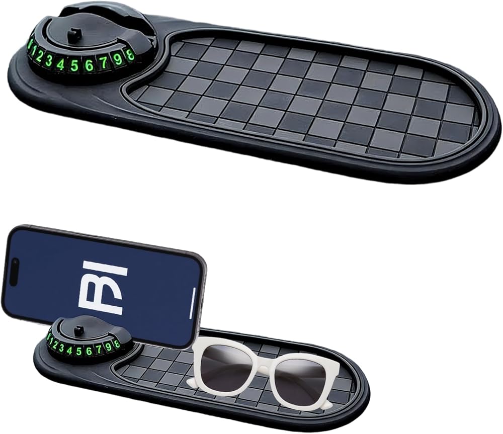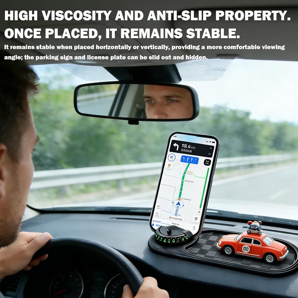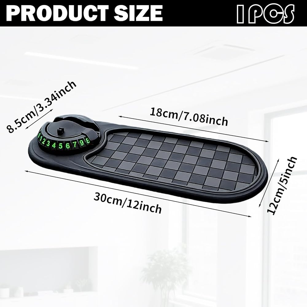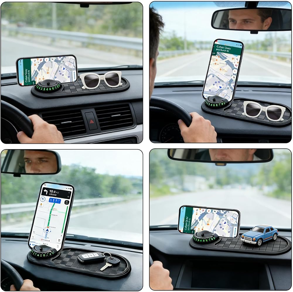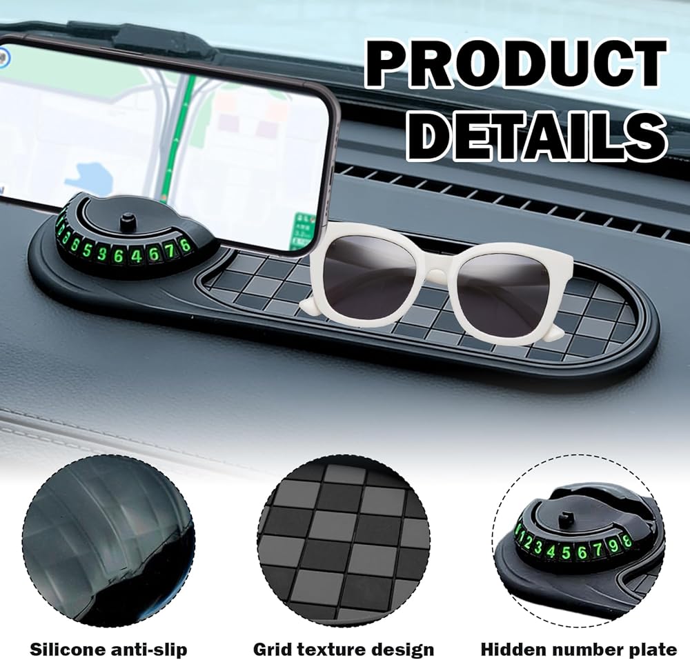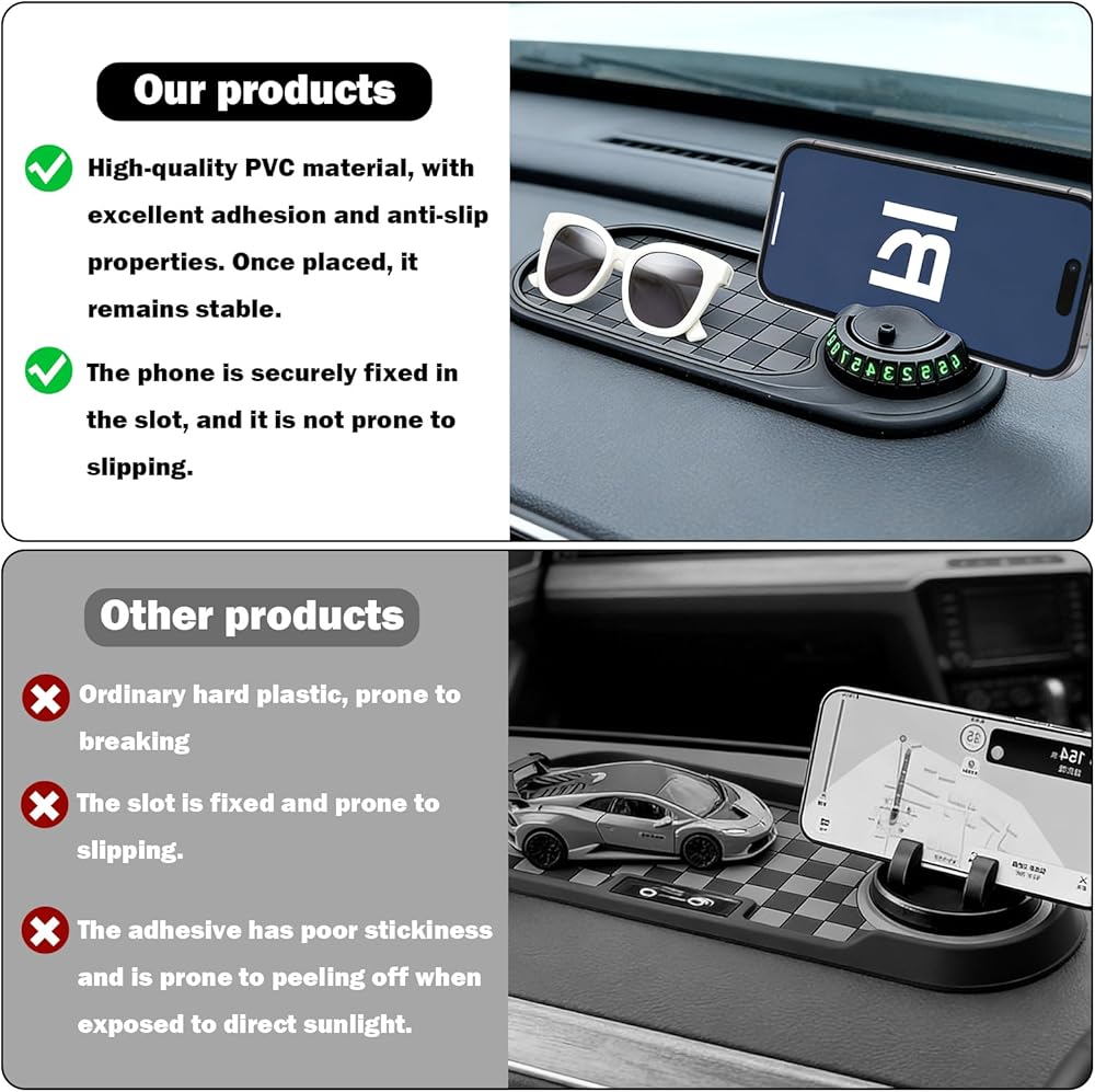 【Multifunctional Car Anti-Slip Mat】Multifunctional Car Anti-Slip Mat Can Hold Small Items Such As Keys, Sunglasses, And Coins, And Is Equipped With An Anti-Slip Mat To Ensure That Important Items Are Safe, Secure, And Easily Accessible. 【Superior Anti-Slip Performance】Multifunctional Car Anti-Slip Mat Features An Anti-Slip Design To Firmly Hold Your Phone, Sunglasses, Keys, And Other Electronic Devices While Driving. 【Multi-Functional Design】Multifunction Car Anti-Slip Mat Is Equipped With A 360-Degree Rotating Phone Holder, Allowing You To Easily View Your Phone Without Obstructing Your Driver's View. Simply Rotate To Hide Or Show Your Phone, And Numbers Outside The Car Window Remain Clearly Visible. 【Easy To Use】Multifunction Car Anti-Slip Mat Is Very Simple To Use; Simply Place It On The Dashboard Or Center Console, No Complicated Installation Steps Required. 【Heat-Resistant And Durable】Multi Function Car Anti Slip Mat Can Withstand High Summer Temperatures And Low Winter Temperatures, And Is Not Easily Deformed Or Cracked, Ensuring Long-Lasting Durability.