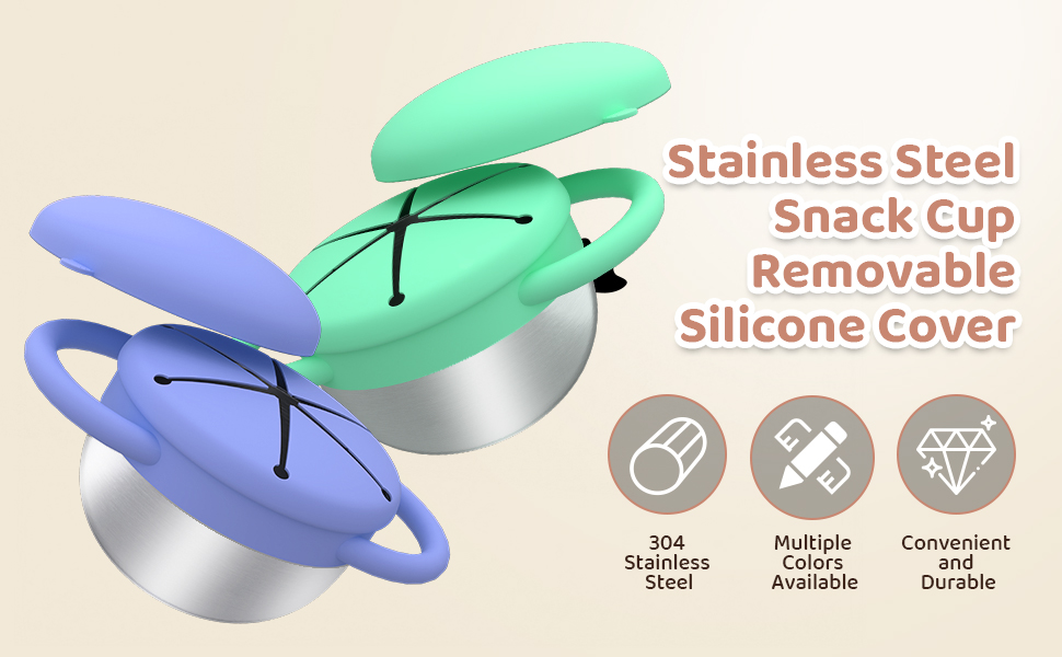 مواد آمنة ومتينة: حاوية الوجبات الخفيفة الخاصة بنا مصنوعة من السيليكون الصالح للطعام والفولاذ المقاوم للصدأ 304، وخالية من البيسفينول والرصاص واللاتكس والبيسفينول إس. خضعت جميع المواد لاختبارات سلامة صارمة لضمان سلامة طفلك. إنه الخيار الأمثل لعائلتك.