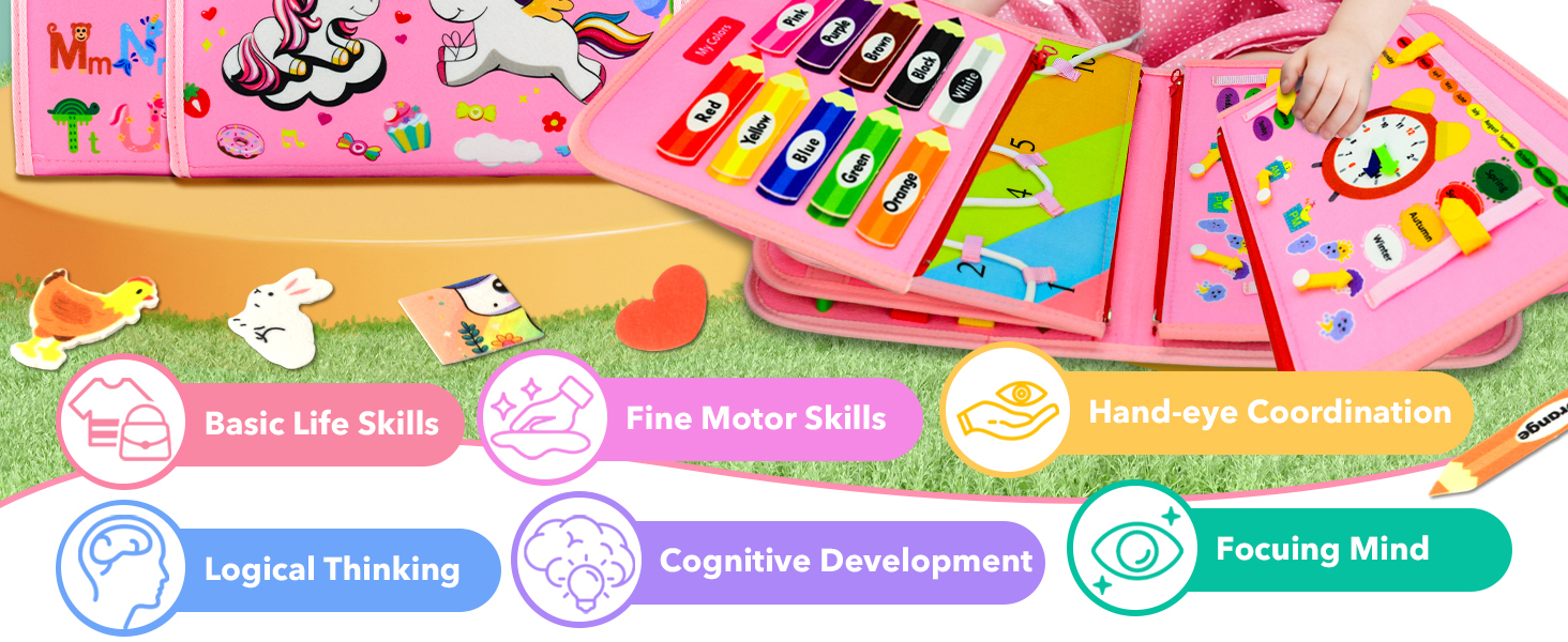 【8 صفحات، متعة لا نهاية لها】تحتوي لوحة Pnooe montessori المزدحمة للأطفال الصغار على 8 صفحات للعب، وتتميز بمجموعة واسعة من أنشطة الأطفال الصغار، ويمكن أن تبقي طفلك مشغولاً ومستمتعًا لساعات. تم تصميم لوحة أنشطة الأطفال الصغار هذه بصعوبة متفاوتة من 2 إلى 4 مستويات لتكون صعبة ولكن ليس كثيرًا لإبقاء أطفالك مهتمين. أكثر من 30 نشاطًا تعليميًا للأطفال الصغار للتمرين والاستكشاف، مثل أربطة الأحذية، والسحابات، والأزرار، ومطابقة الأشكال، ومطابقة الألوان، وتعلم الحروف الأبجدية، وتعلم الساعة والتقويم، وألغاز يونيكورن، ولعبة المزرعة، ولعبة الخيوط، وما إلى ذلك.
