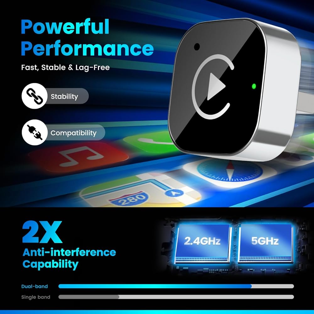 ✅ اتصال سريع ومستقر: مدعوم بوحدة WiFi متقدمة مزدوجة النطاق، يوفر هذا الدونجل اللاسلكي 2 في 1 إمكانية التنقل دون أي تأخير، وتدفق صوتي واضح، وأدوات تحكم تعمل باللمس فائقة الاستجابة. يقلل التأخير أثناء استخدام خرائط Google، أو Apple Maps، أو Waze، أو Spotify، أو YouTube Music، مما يضمن تجربة قيادة متصلة سلسة دون انقطاع.