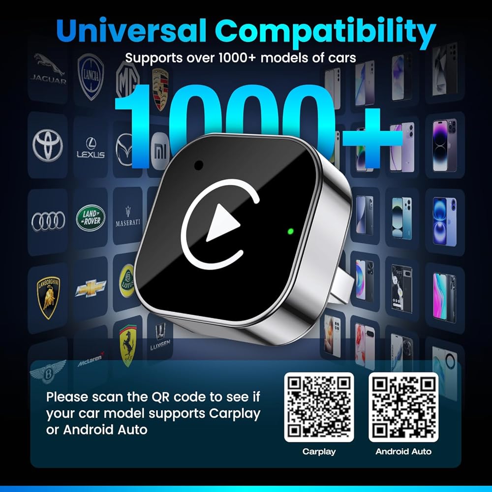 ✅ توافق عالمي: يعمل مع معظم المركبات المجهزة بنظام CarPlay السلكي من المصنع أو Android Auto (سنوات الطراز 2016-2025). يدعم تمامًا أجهزة iPhone iOS 10+ وAndroid 11+ والأسر ذات الأجهزة المختلطة، ويتضمن موصلات USB وUSB-C لتحقيق أقصى قدر من المرونة. متوافق مع العلامات التجارية الكبرى: فورد وهوندا وتويوتا ونيسان وبي إم دبليو ومرسيدس وشيفروليه وكيا وهيونداي والمزيد.
