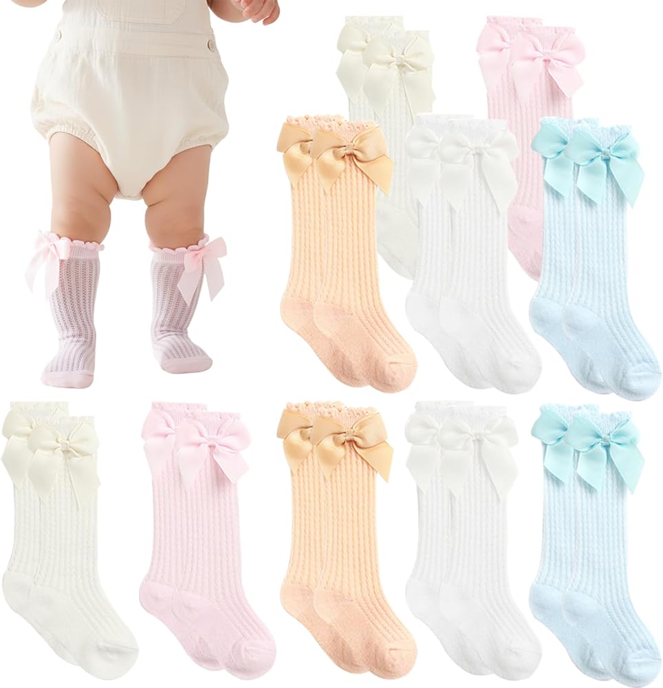 2.The 10 pair set ensures you always have clean socks ready for your little one. Made from soft cotton, these knee high baby socks provide gentle coverage without irritating delicate skin. The classic bow detail adds a touch of elegance, while the gender-neutral colors make them suitable for both baby girls and boys. Ideal for daily wear, hospital visits, or special occasions, these socks are a practical and thoughtful gift for new parents.