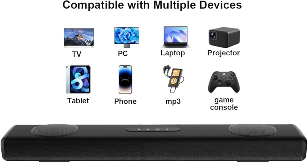 COMPACT AND WALL-MOUNTABLE: With a sleek, compact design, the soundbar fits neatly under smaller TVs or PCs. Optimized for small spaces—such as bedroom, garage, or office—it elevates your movie and music experience.