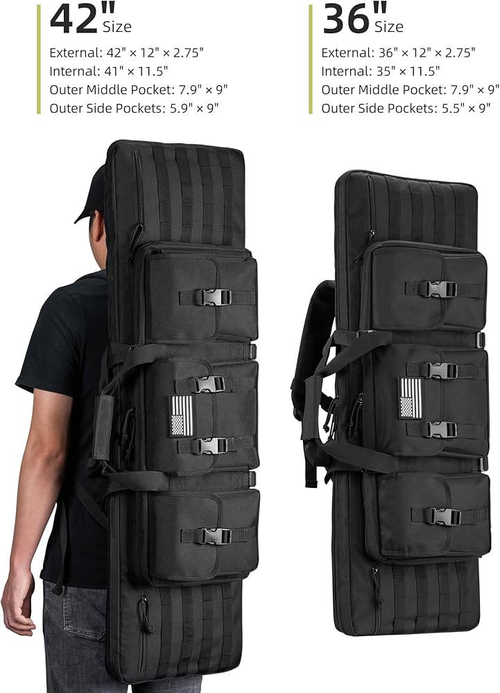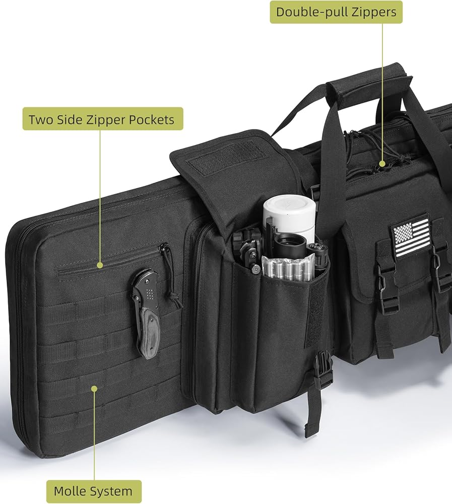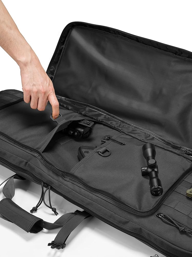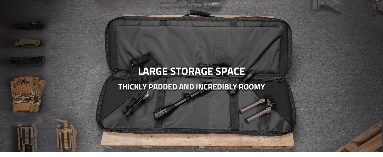 مساحة تخزين كبيرة: أبعاد حقيبة البندقية هذه هي 42 بوصة طول × 12 بوصة ارتفاع، تناسب بنادق يصل طولها إلى 40 بوصة. مع حجرة رئيسية لبندقيتين طويلتين ومسدسات متعددة، وحجرة ثانوية إضافية وخمسة جيوب خارجية، تحتوي حقيبة البندقية هذه على مساحة تخزين واسعة