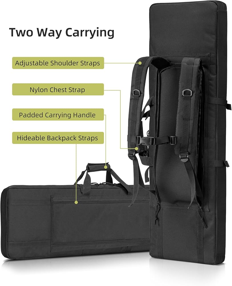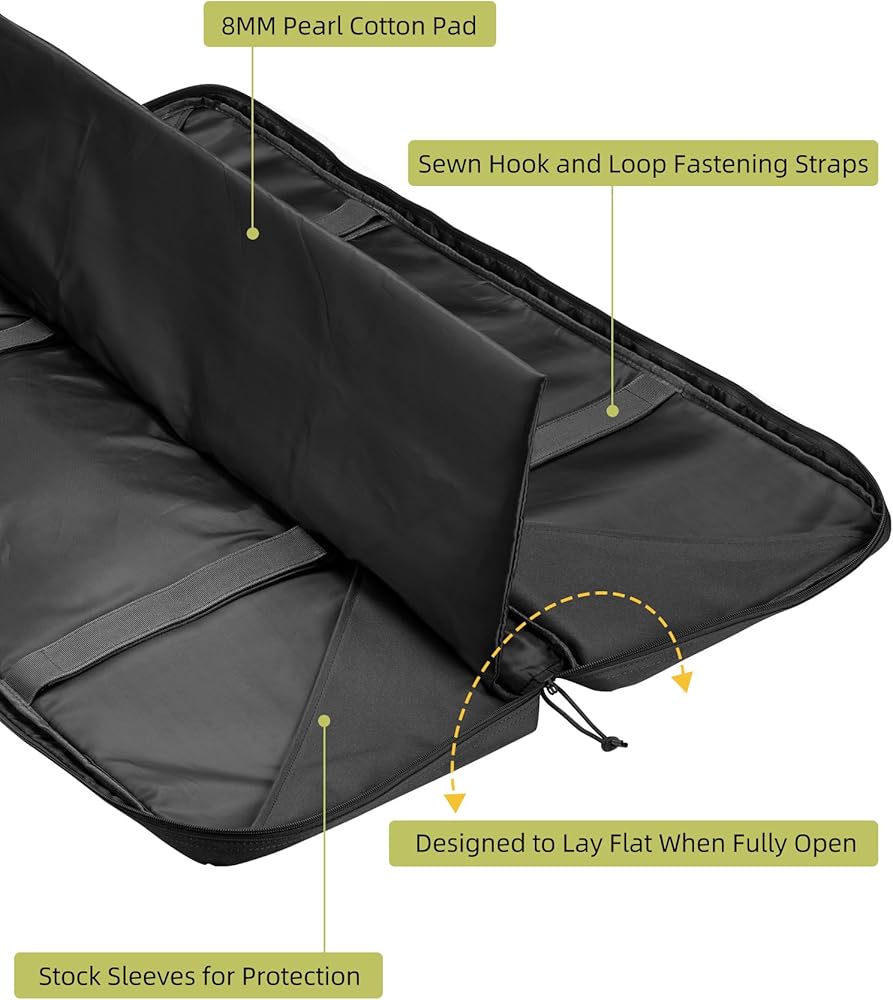 مصنوعة بشكل جيد: حقيبة البندقية الناعمة الخاصة بنا مصنوعة من نايلون PVC الصناعي عالي التحمل 600D، وهو مقاوم للماء والغبار. حقيبة البندقية مبطنة بالكامل لتوفير الحماية الشاملة لمعداتك، وهي مناسبة لتخزين الأسلحة ونقلها