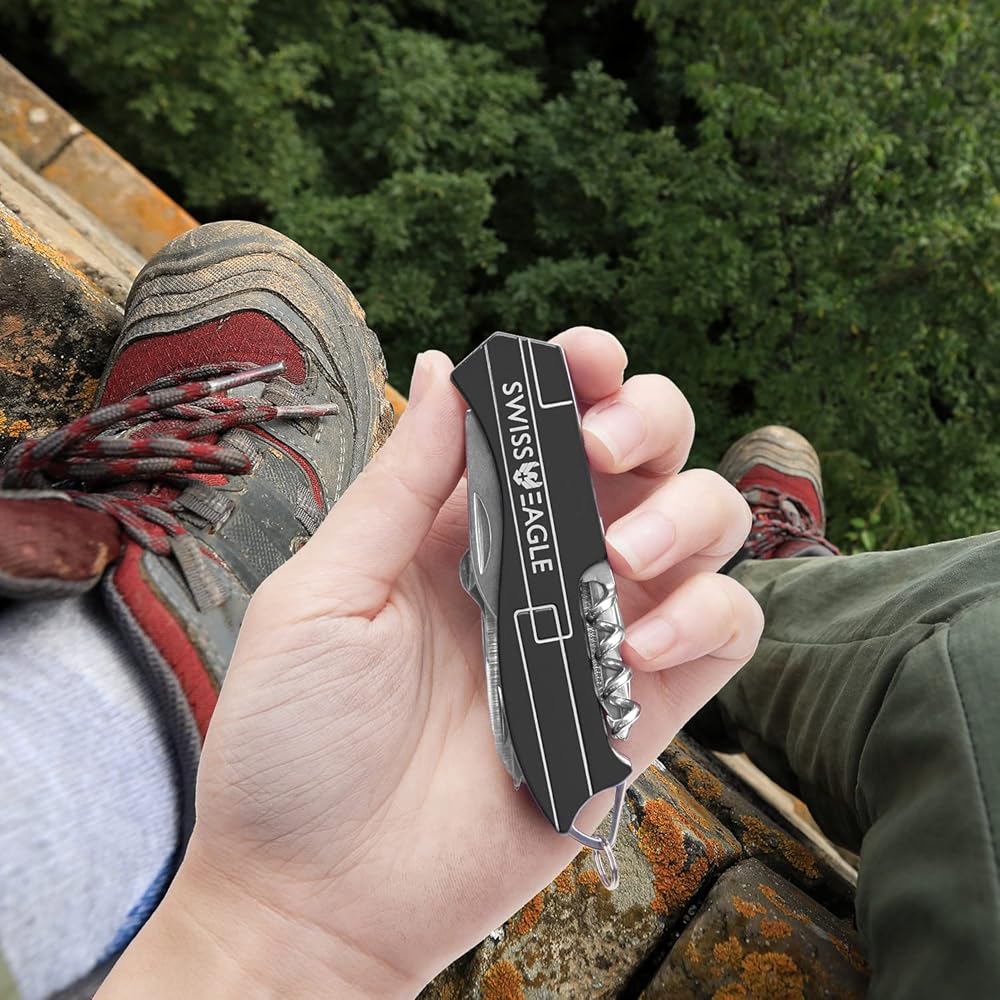 أداة حمل وإمساك المنزل الصغيرة 9 في 1 من سويس إيجل، ممتازة مع شفرة ومقص ومفك براغي وزردية وعدسة مكبرة وملقاط هدايا عيد الميلاد - أزرق (أسود)