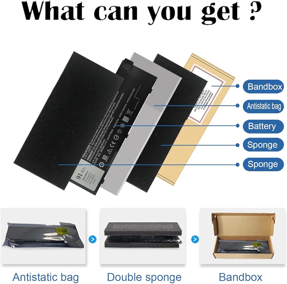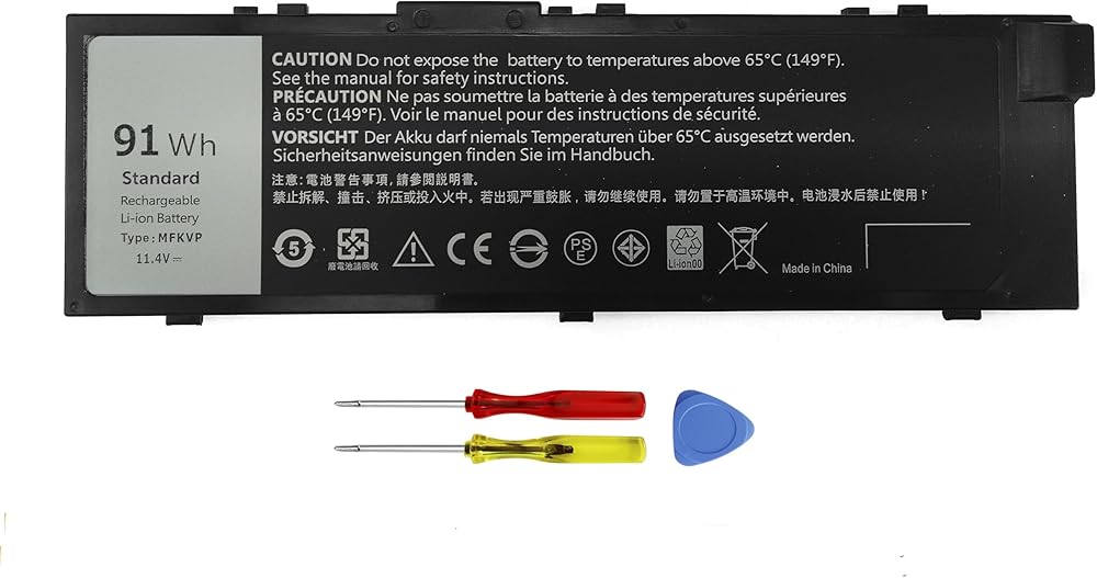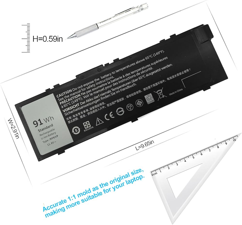 91Wh Standard Rechargeable Li-ion battery Type MFKVP ; Voltage : 11.4V; Capacity : 91Wh; Cells: 6-Cell; Size about 9.6x3x0.55in, Weight: About 15OZ / 0.94lb; Condition : Brand New; Life span: UP to 500 discharge per charge cycles