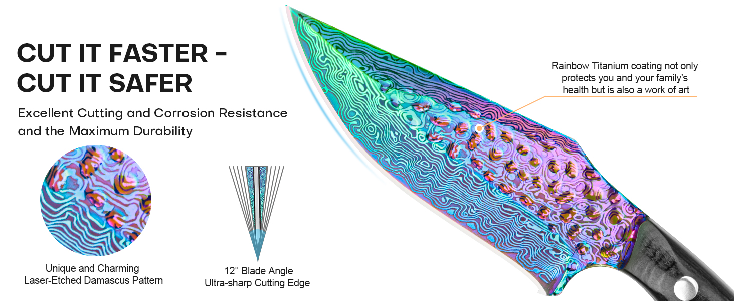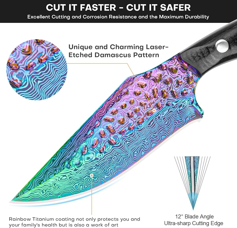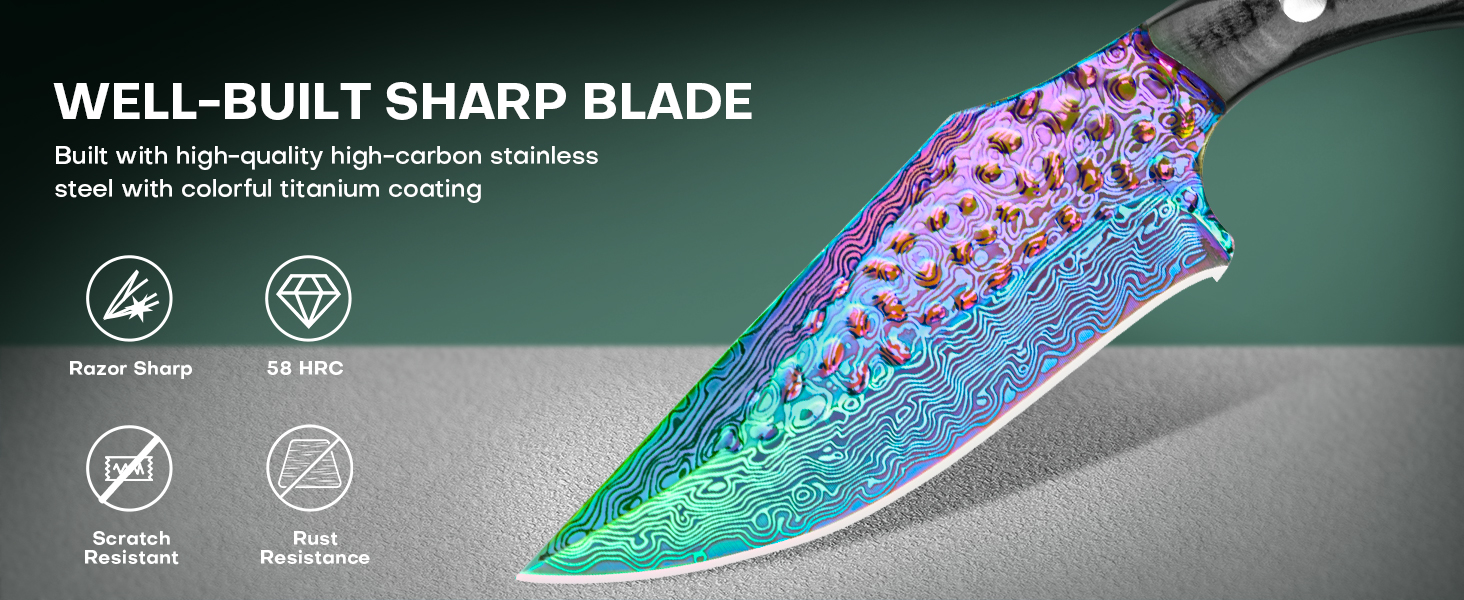 آمن للاستخدام في غسالة الأطباق وطلاء مضاد للصدأ: لا يضيف الطلاء الملون لمسة نابضة بالحياة فحسب، بل يحمي أيضًا السكاكين من الصدأ عن طريق حمايتها من الاتصال المباشر بالأكسجين. حماية صحة عائلتك. مع الطلاء غير اللاصق، تبقى السكين ذات الشفرة الثابتة نظيفة وأصلية طوال اليوم، سواء للمغامرات الخارجية أو الاستخدام اليومي.