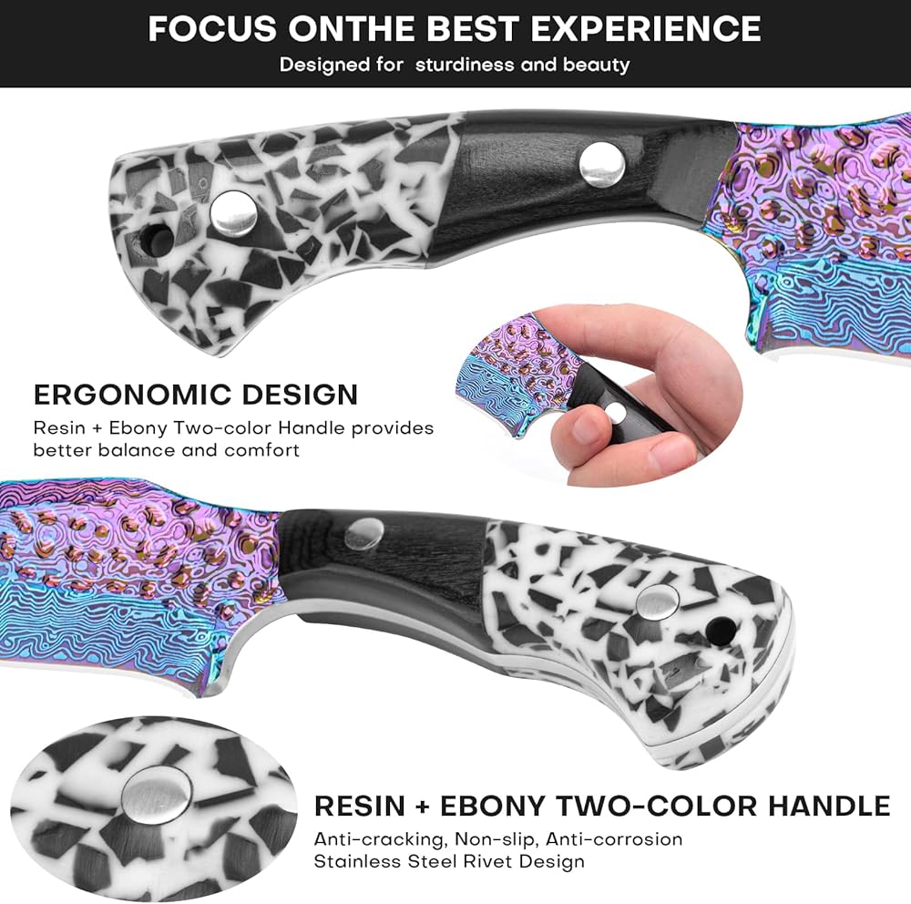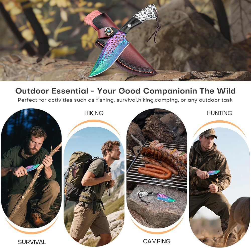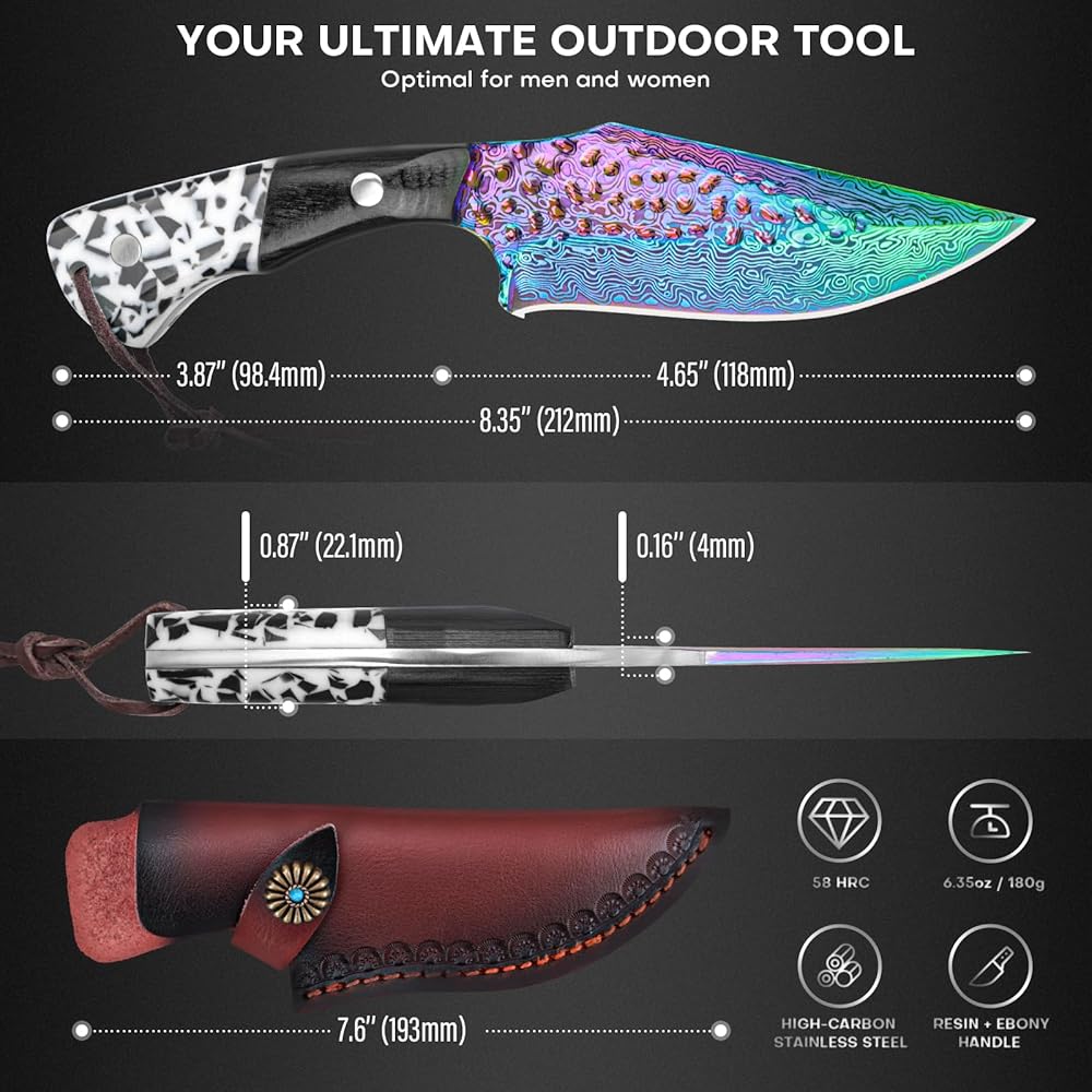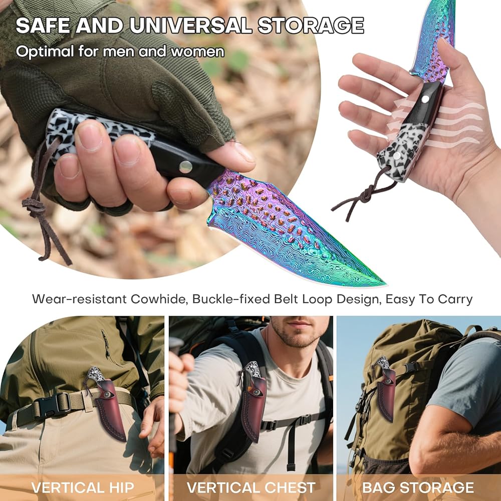 قبضة مريحة: تعتبر سكين الصيد ذات الغلاف الجلدي هدية مثالية لعشاق السكاكين. يوفر المقبض المريح ذو اللونين المصنوع من الراتنج والأبنوس تجربة معالجة مريحة وممتعة، مما يضمن قبضة سلسة وآمنة. إنه مثالي للرجال والنساء، مما يجعله أداة مناسبة للصيادين، والتخييم، وعشاق الحياة البرية، والناجين، والحمل اليومي.