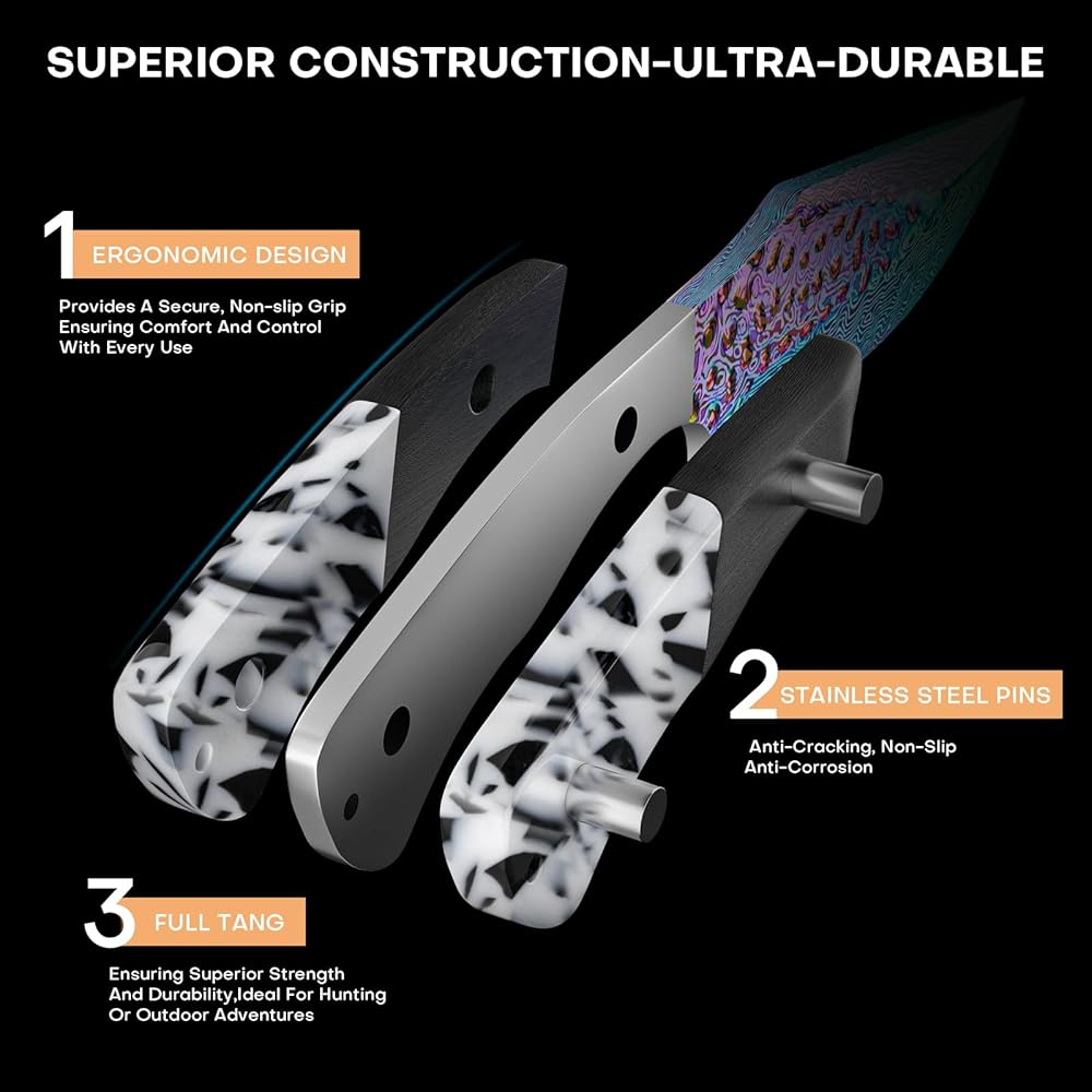 هيكل صلب: السكين ذو الشفرة الثابتة بالكامل يجعل هيكل السكين أقوى وأكثر متانة، مما يسمح له بمقاومة القوى التي تمارس بشكل أفضل أثناء الاستخدام. الشفرة المحفورة بالليزر والفريدة من نوعها والملونة على شكل دمشق مصنوعة بحرفية تقليدية. إنها لا تؤدي أداءً جيدًا فحسب، بل تجعلك أيضًا مركز الاهتمام، مما يجعلها أداة EDC أساسية للمغامرين وإضافة قيمة لأي مجموعة