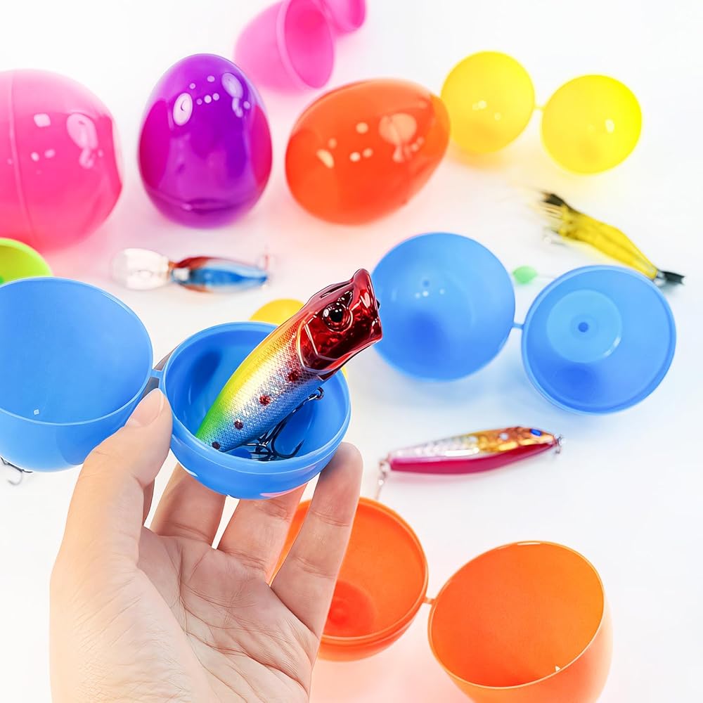 Easter Eggs Hunt - The 2026 Easter is coming soon. If you're looking for candy-alternative Easter egg ideas, these plastic Easter eggs include varieties of fishing lures that will be a good choice. Great for Easter egg hunts or Easter basket stuffers, Excited to open each easter egg they hunt in the coming Easter! Stuffed Easter eggs hunt in assorted fishing lures - include fspoon lures, soft plastic lures, Popper, Minnow, VIB, Frog, and more,These surprise egg fishing lures perfect fits for Easter eggs party favors, Easter basket fillers, Easter eggs fillers, stockings stuffers, birthday party, Easter goodie bag stuffers, Easter classroom exchange prize supplies, carnival prizes.