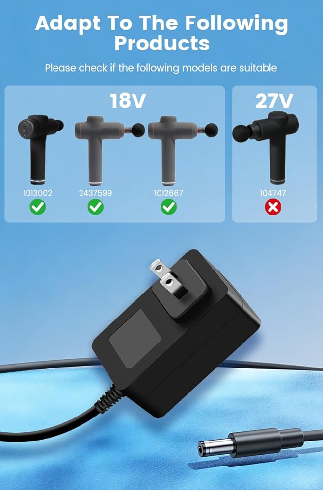 [Important Notice] This charger is specifically designed for 18V models and is not compatible with 27V devices. Before purchasing, please verify the listed compatible product list, power plug specifications, and output voltage to ensure compatibility with your massage gun