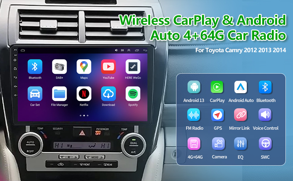[4+64G] Android 13 Car Stereo with Wireless Apple Carplay & Android Auto for Toyota Camry 2012-2014 10.1" Touchscreen Radio Upgrade with AHD Camera,GPS Navigation,SWC,WiFi,FM,Bluetooth