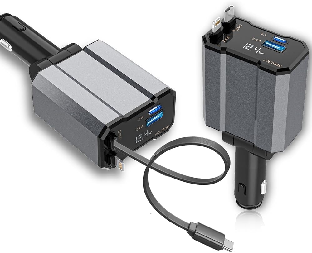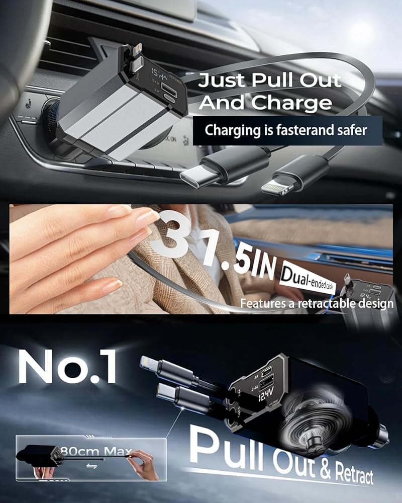 تصميم قابل للسحب | تصميم داخلي خالٍ من التشابك ونظيف: قل وداعًا للكابلات الفوضوية! يتميز شاحن السيارة القابل للسحب بكابلين شحن مدمجين قابلين للسحب تلقائيًا، مما يحافظ على تنظيم سيارتك وخالية من الفوضى. لا غنى عنه للحصول على مقصورة داخلية نظيفة ومرتبة.