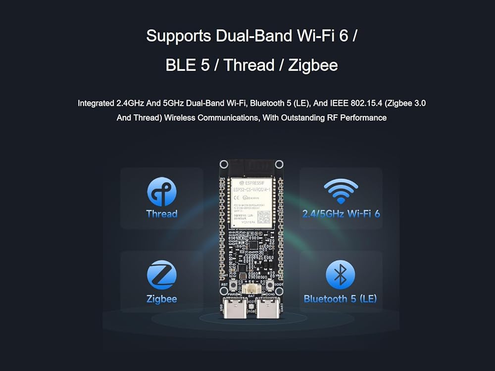 The ESP32-C5-WIFI6-KIT is a development board designed by Waveshare based on the ESP32-C5-WROOM-1 module for dual-band Wi-Fi and multi-protocol IoT gateway applications. The ESP32-C5 is a single-core RISC-V chip, supports dual-band Wi-Fi 6 (2.4GHz and 5GHz), and integrates BLE 5, Zigbee, and Thread protocols for flexible use as a smart home hub or cross-protocol communication gateway.
