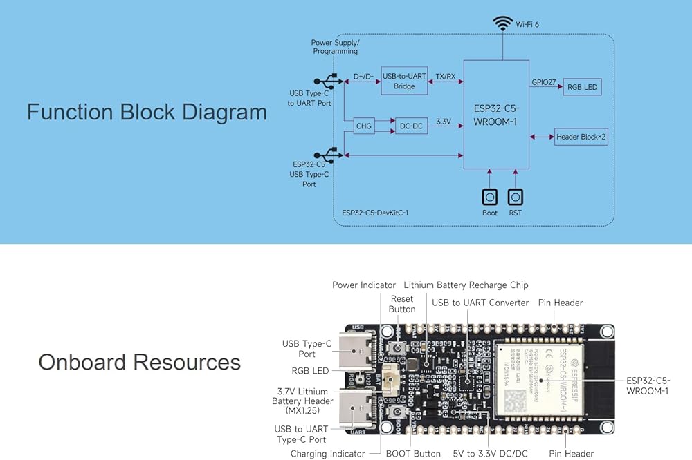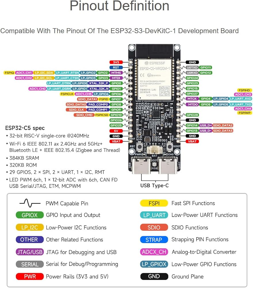 --Adopts ESP32-C5-WROOM-1 series module with RISC-V 32-bit processor, up to 240MHz main frequency