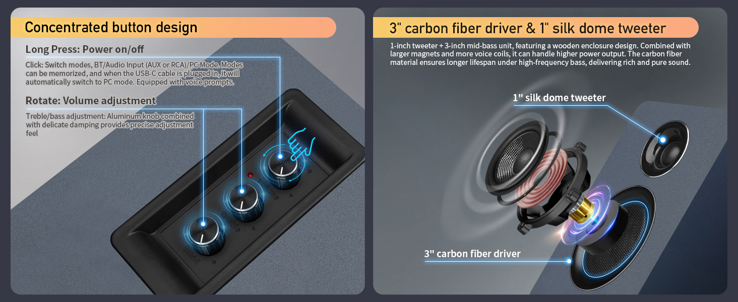 جودة صوت استثنائية: يوفر مشغل الجهير المتوسط المصنوع من ألياف الكربون مقاس 3 بوصة، والمدعوم بمضخم صوت بقدرة 60 وات، صوت جهير قوي ونغمات غنية متوسطة المدى. مقترنًا بمكبر صوت على شكل قبة حريرية مقاس 1 بوصة، فهو يضيف مستويات عالية من الوضوح ويعزز أداء الصوت الإجمالي. ومع منحنى التردد المضبوط بشكل احترافي، ينتج النظام صوتًا متوازنًا ومتناغمًا عبر جميع الترددات.